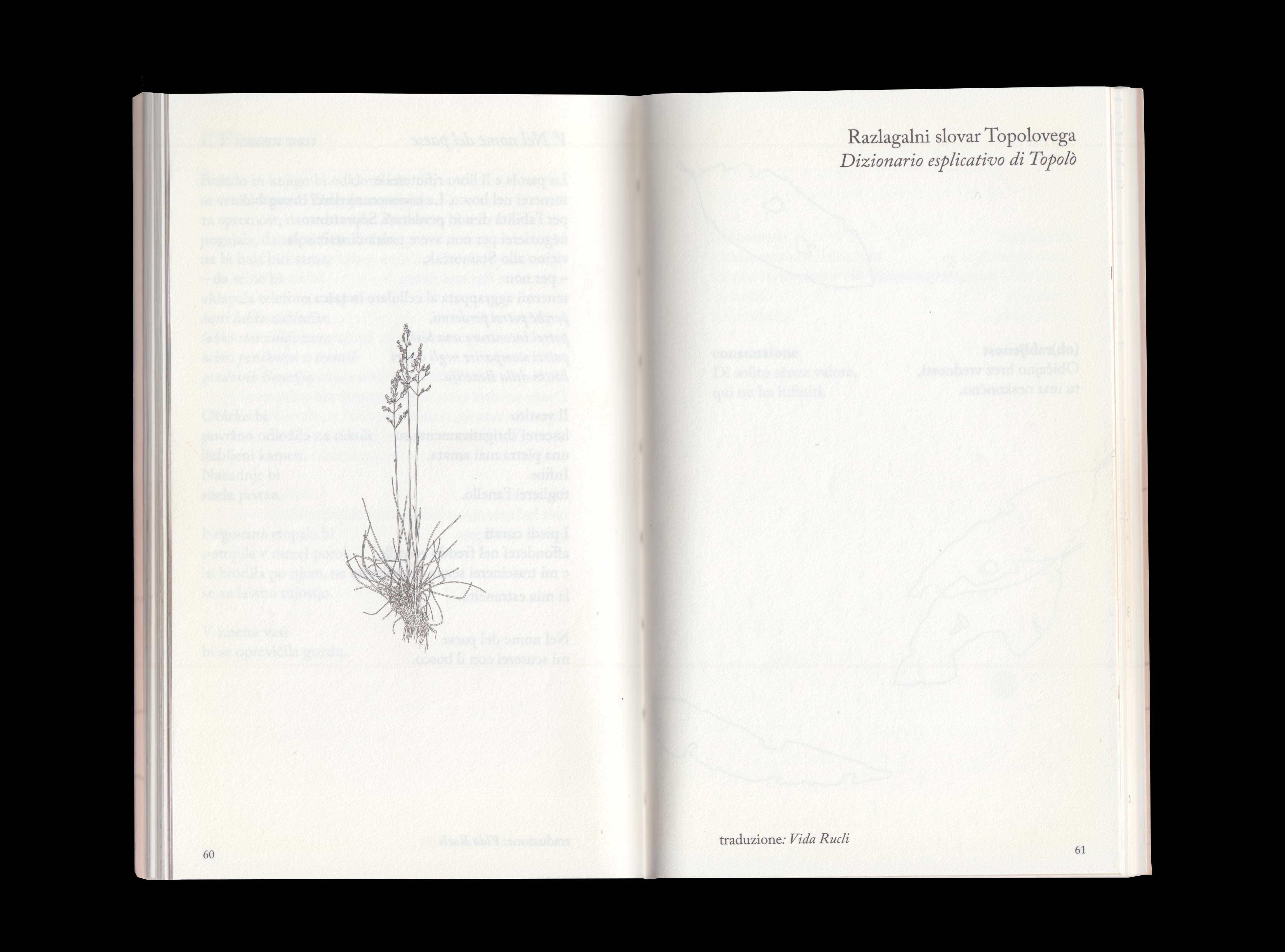 “Nella prima sezione sono raccolte e tradotte dieci poesie tratte dalla sua opera prima, Nonostante l’incertezza. La seconda parte rappresenta il ciclo Nel nome del paese, che è germogliato a Topolò ed ha continuato a maturare lontano, mentre la terza sezione o re un’emozionante descrizione di come abbia vissuto il tempo, i luoghi e le persone durante la residenza nel paesino al con ne tra Italia e Slovenia.
