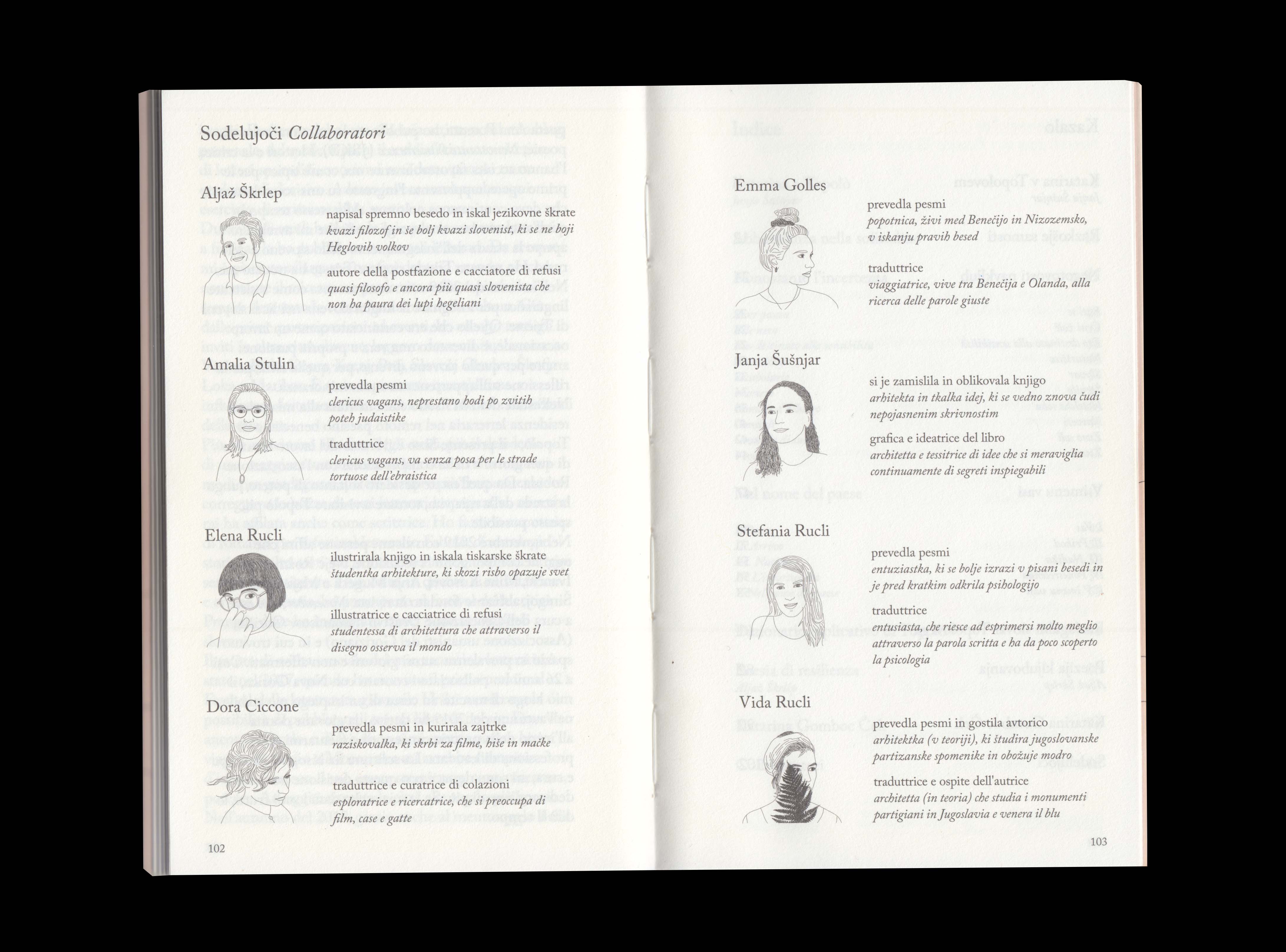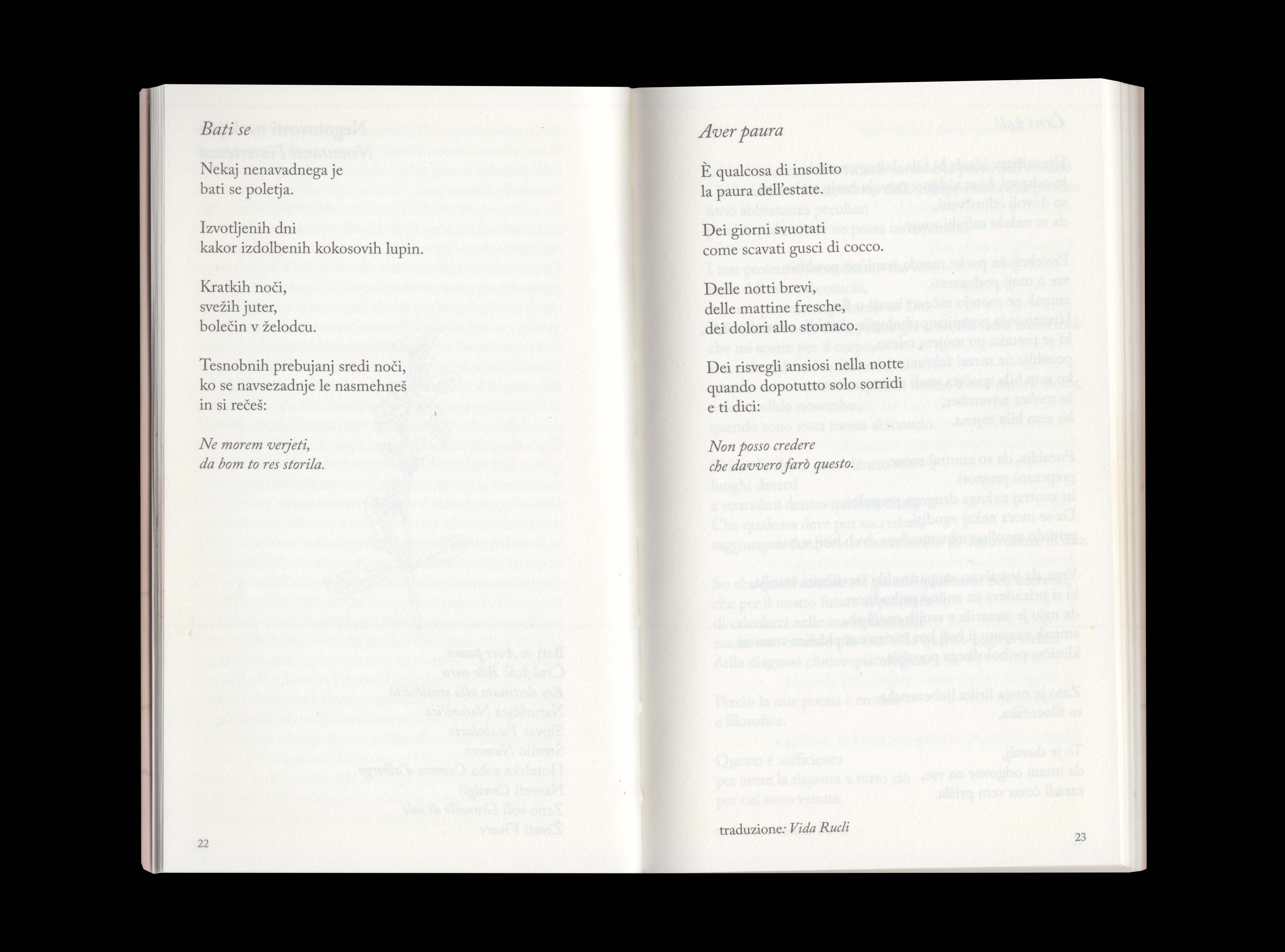 La raccolta di poesie parla di un luogo specifico a più livelli. Non solo attraverso l’esperienza interiorizzata e le parole della giovane poeta, ma anche tramite il coinvolgimento di tutti i collaboratori che, con le proprie idee, la progettazione e le traduzioni hanno contribuito al prodotto finale. Questo luogo ha infatti lasciato un segno diverso in ognuno di noi e, nonostante l’incertezza che lo caratterizza, rimane fonte di poesia nei nostri processi creativi.” - Janja Šušnjar