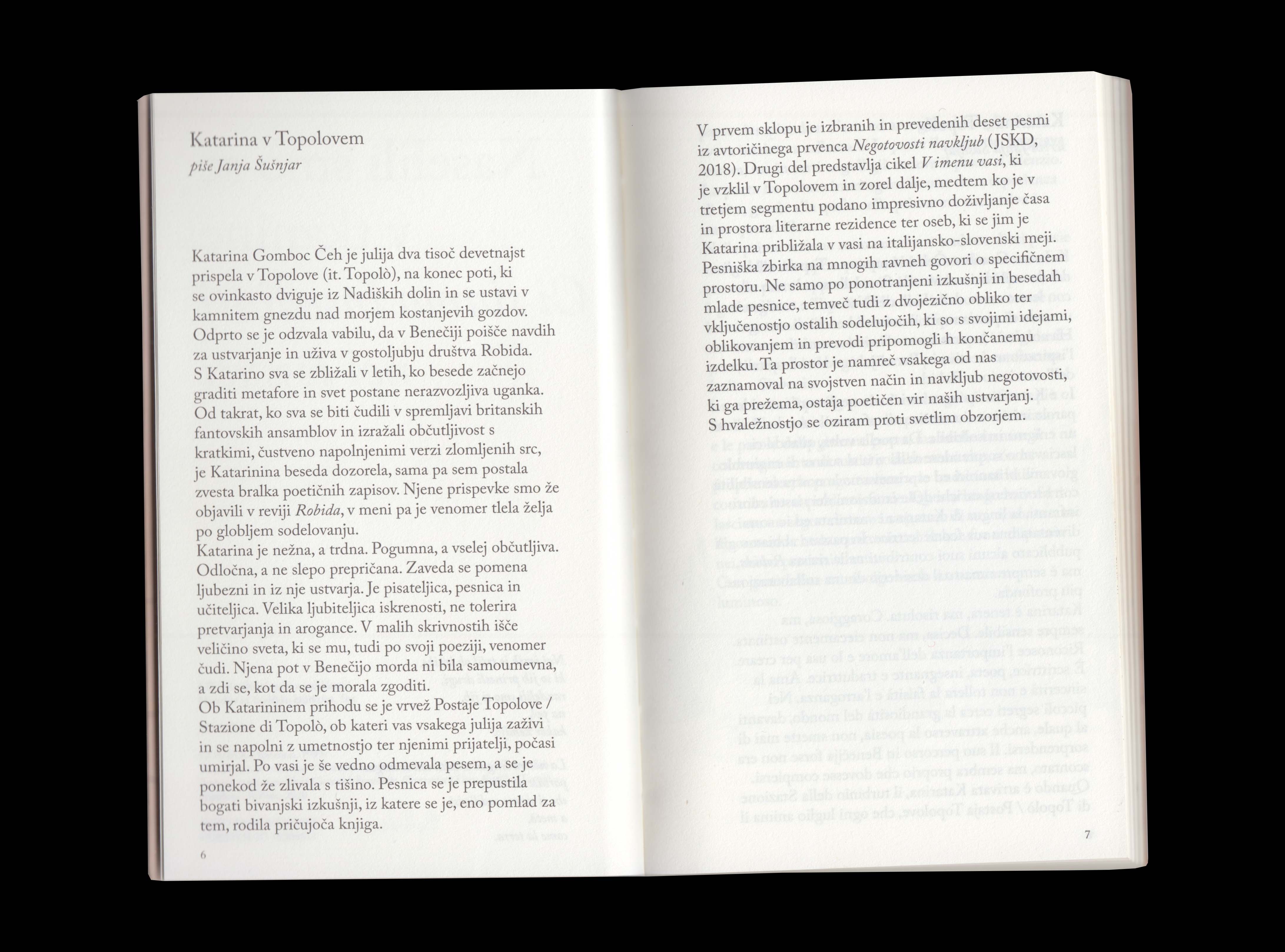 “Katarina Gomboc Čeh je julija dva tisoč devetnajst prispela v Topolove (it. Topolò), na konec poti, ki se ovinkasto dviguje iz Nadiških dolin in se ustavi v kamnitem gnezdu nad morjem kostanjevih gozdov. Odprto se je odzvala vabilu, da v Benečiji poišče navdih za ustvarjanje in uživa v gostoljubju društva Robida.” Janja Šušnjar, uvodnik