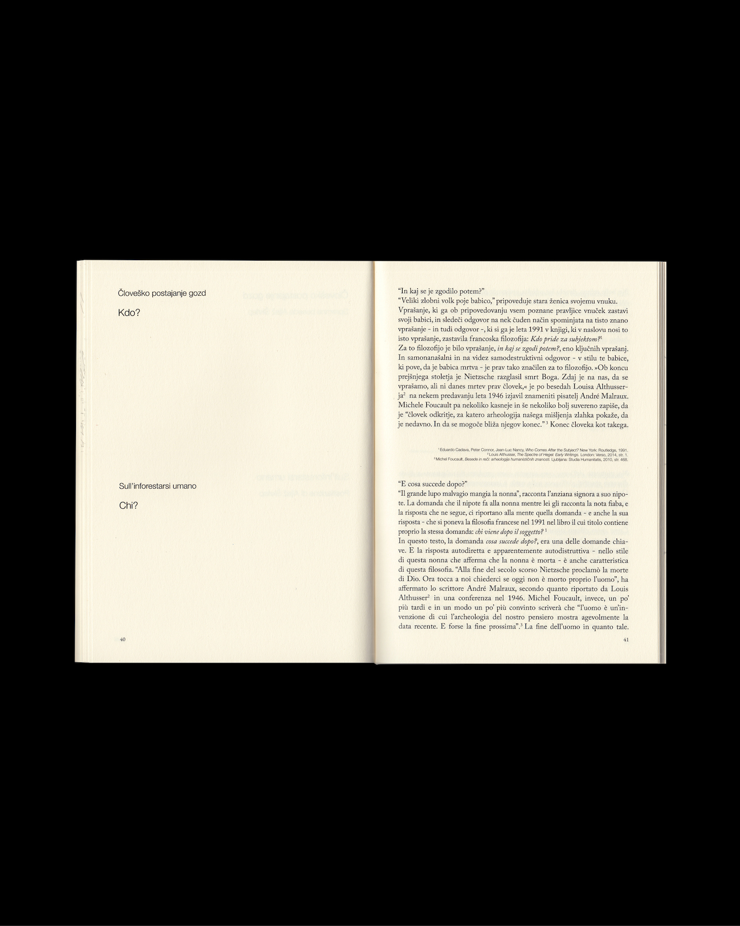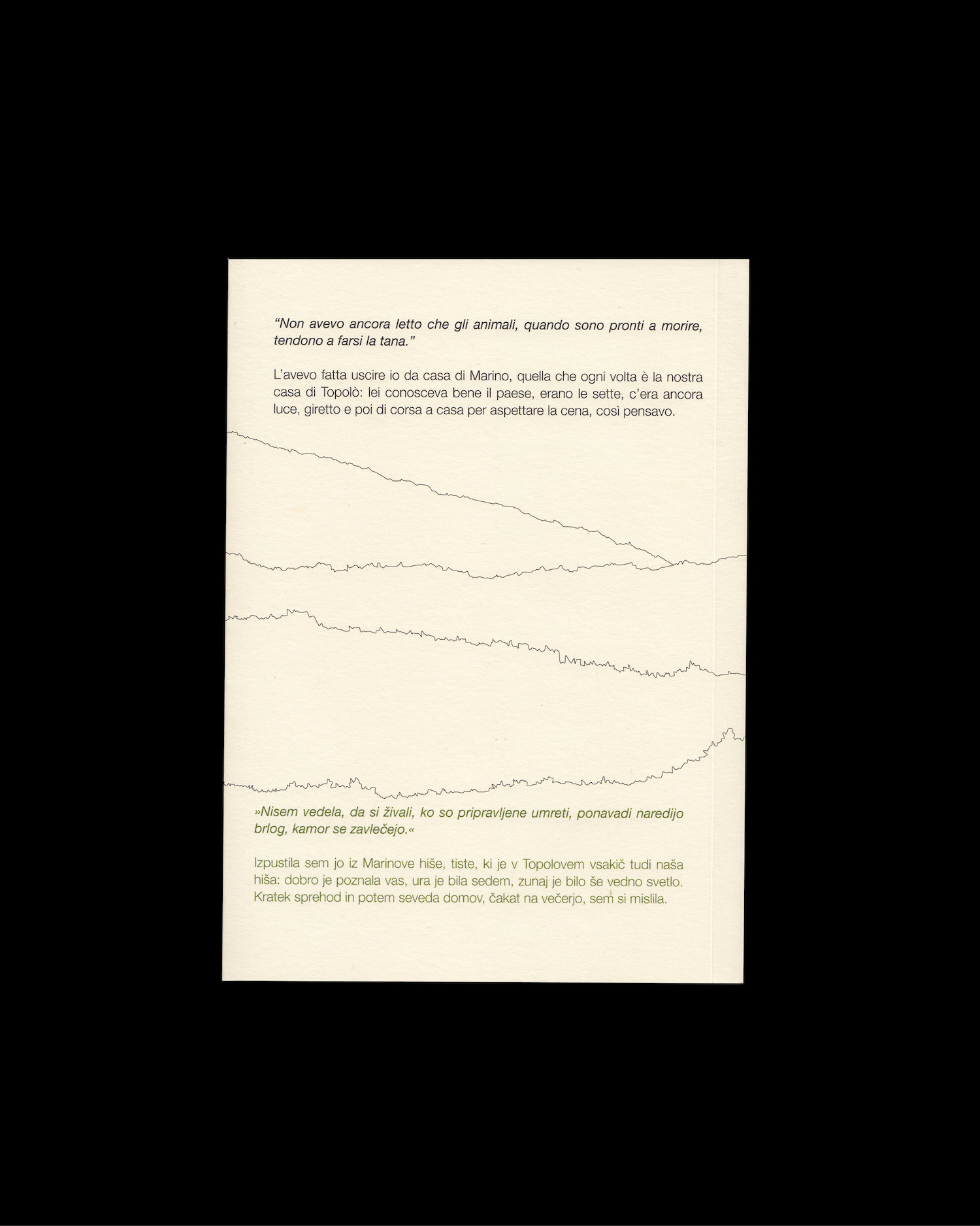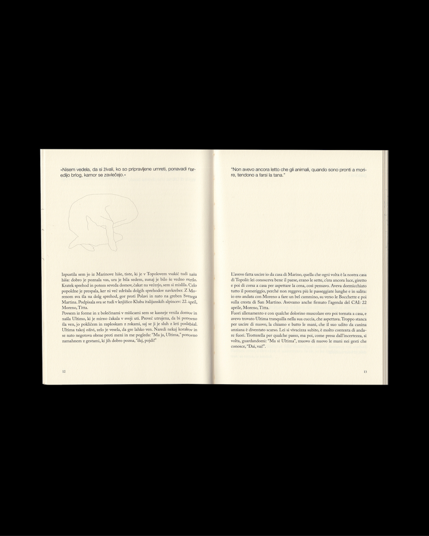 One evening in April, in Topolò/Topolove, a village immersed in the woods on the border between Italy and Slovenia, Ultima, a fifteen-year-old canine, a hound with spotted fur and a superb sense of smell, left home for her evening walk. But she never came back. In the timeless days of the search, despite the desperation and sadness, a sense of wonder and gratitude also emerged immediately: not only for the life spent together, but also for this open and entirely animal ending from which we should learn again and again.
