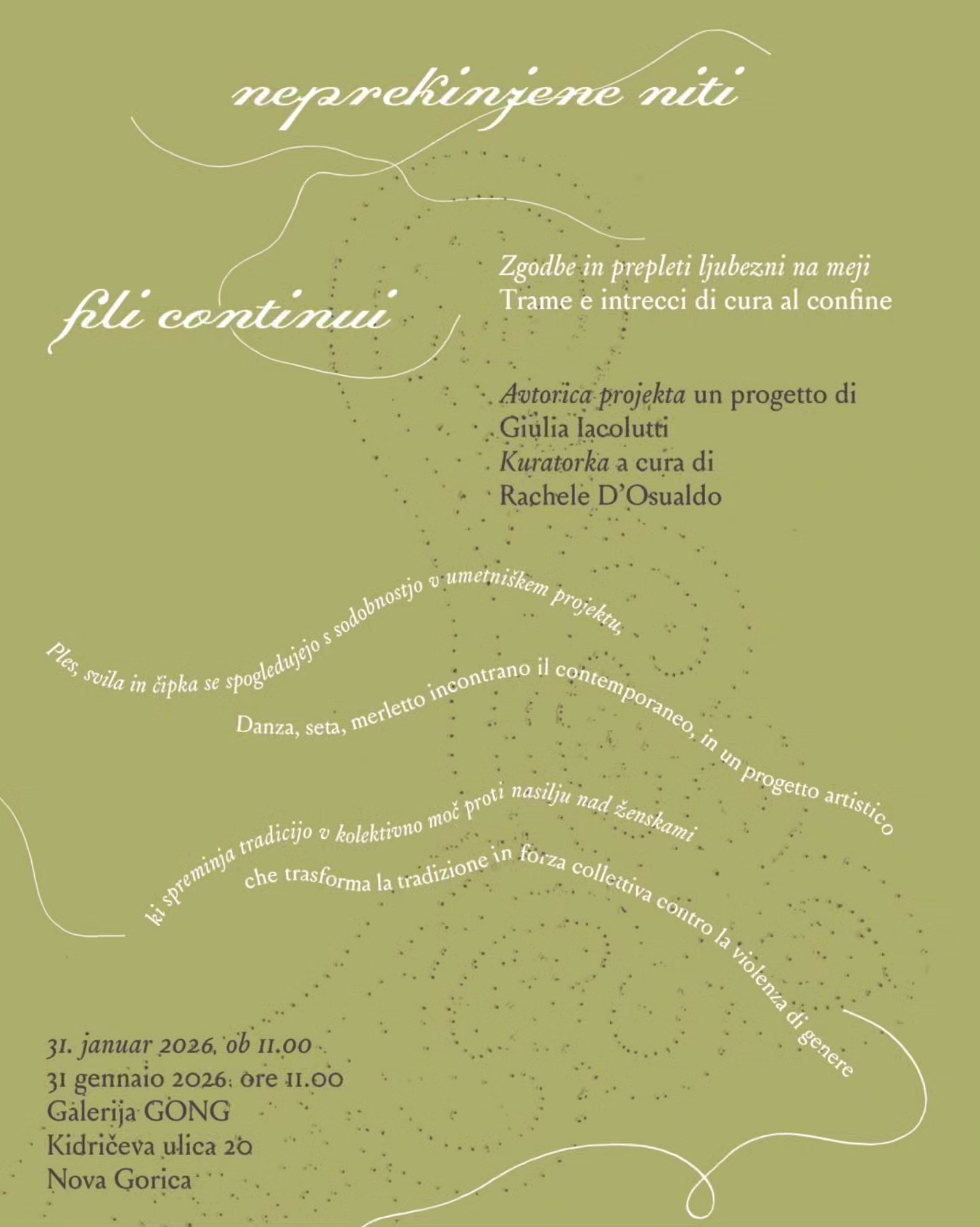 In occasione dell'apertura della mostra di Giulia Iacolutti, curata da Rachele D'Osualdo, Fili Continui, Radio Robida si trasferisce per un pomeriggio, dalle 14.00 alle 15.00, alla galerija Gong di Nova Gorica che ospiterà una chiacchierata live tra le Robide, Giulia, Rachele, e Antônio Frederico Lasalvia, autore dell'allestimento della mostra sul progetto Fili Continui.