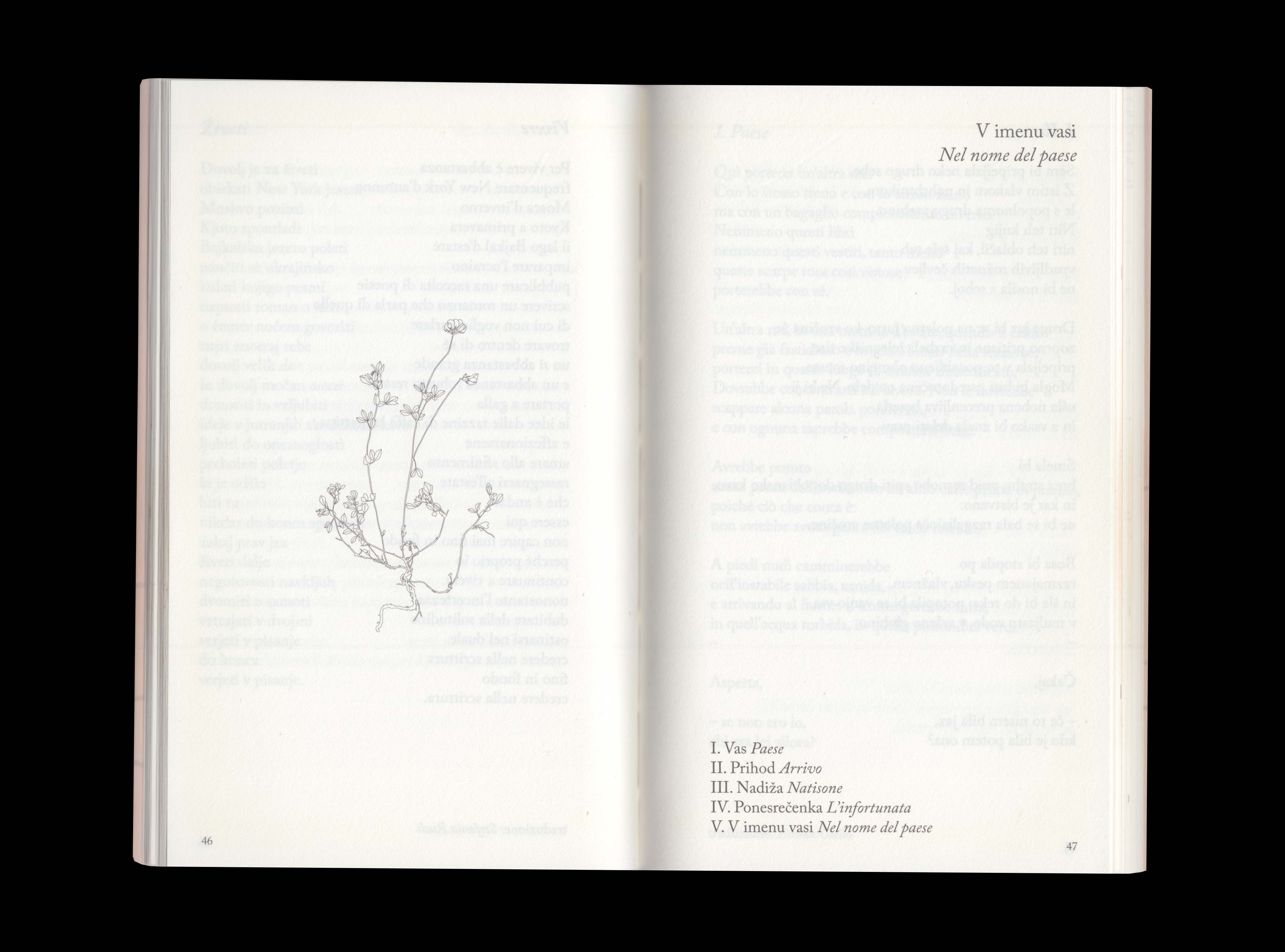 “Nella prima sezione sono raccolte e tradotte dieci poesie tratte dalla sua opera prima, Nonostante l’incertezza. La seconda parte rappresenta il ciclo Nel nome del paese, che è germogliato a Topolò ed ha continuato a maturare lontano, mentre la terza sezione o re un’emozionante descrizione di come abbia vissuto il tempo, i luoghi e le persone durante la residenza nel paesino al con ne tra Italia e Slovenia.