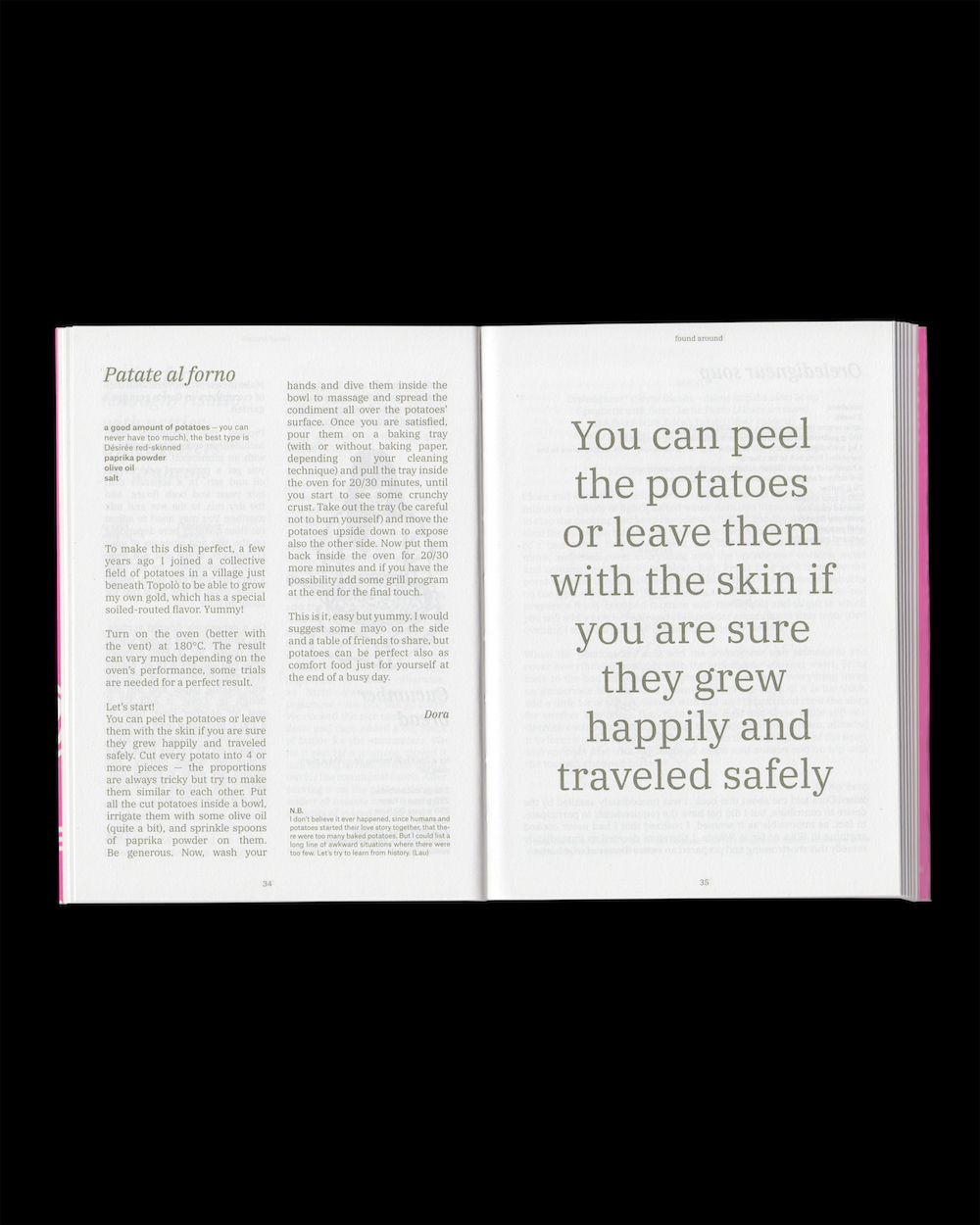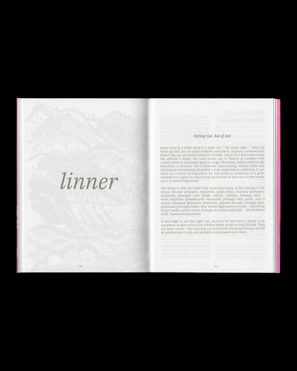 This publication, just like IZBA, is a small universe boiling with friendships, lo(l)ve, anecdotes, and of course, recipes. Laura Savina and Ola Korbańska have gathered some of these to create the very first cookbook dedicated to this place. Structured following the day cycle — from breakfast being the most intimate of meals, till the night of dolce (dessert), passing through mountains of gnocchi and blossoming salads, sunsets of aperitivo, finally reaching linner (meals that serve both lunch and dinner) — this book is a travel through time and space: making loops of the daily cycle of feasting in Topolò, and loops of the close and further surroundings of IZBA.