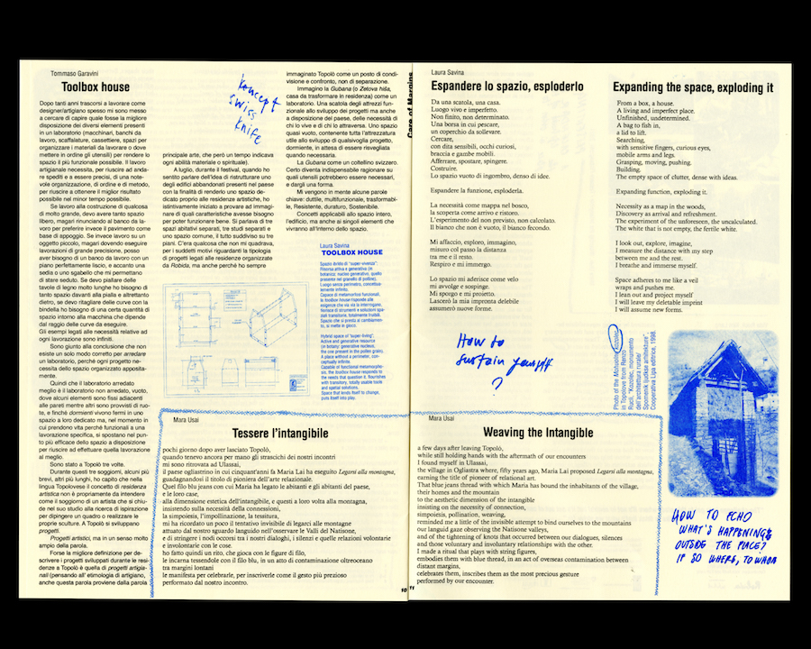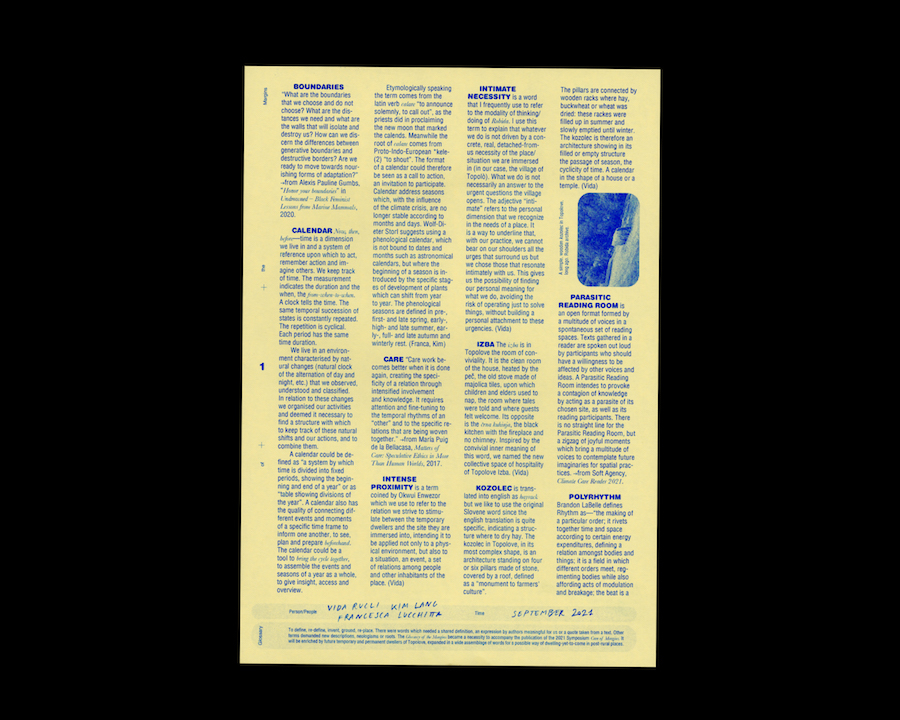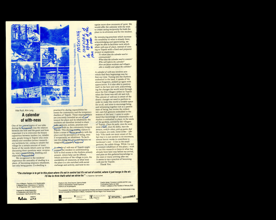 Some of the contributions question the concept of residency in itself, others are very personal memories of those days highlighting the valuable moments, routines and thoughts we shared. Other texts try to transgress dichotomies such as local vs. foreign, insider vs. outsider, host vs. guest, bringing up themes such as translocal connectedness as in the reflections of Curdin Tones. The affective relation between space and temporary or permanent inhabitants is explored in the poetic text of Mara Usai while a more scientific, micro-biological relation to landscape is addressed by Philipp Kolmann. Jack Bardwell reflects on the possibility of a polyrhythmic co-existence of the guests and hosts while Lenn Cox underlines the importance of generative boundaries, referring to personal and collective everyday ecologies. Francesca Lucchitta widely reflects on daily routines, recalling moments and the atmosphere of those days and Janja shares notes on the power of togetherness. Studio Wild focuses on the building up of the residency, imagined as a collective action where taking part in the residency could also mean contributing to the renovation of the building itself, while Tommaso Garavini proposes the beautiful metaphor of the house as a toolbox or as a Swiss pocket knife. Laura Savina speaks of a fertile white, to refer to the countless and wide possibilities opening in front of us when imagining this space, intended as a new, empty, white paper. Besides describing her experience as the first artist in residency to inhabit the village for a longer period of time, Kim Lang focuses on the concept of the calendar as one of the conclusions we reached during the symposium. The calendar is a tool that addresses all the previously mentioned topics: the relation of the artists/researchers/architects/etc. to landscape, their inclusion in the rhythms of the community and the need of sharing with them responsibilities, of making them become dwellers of the village.