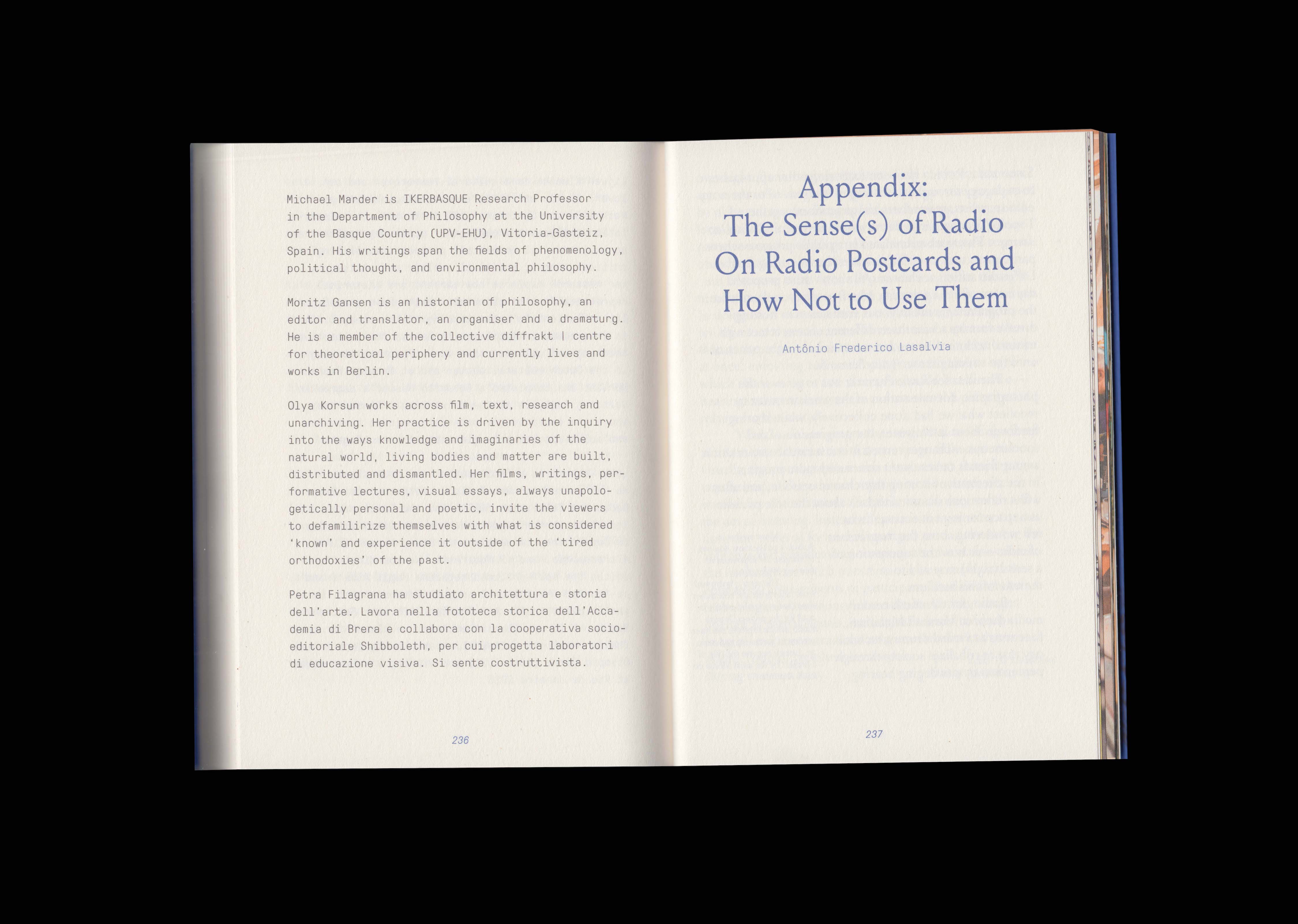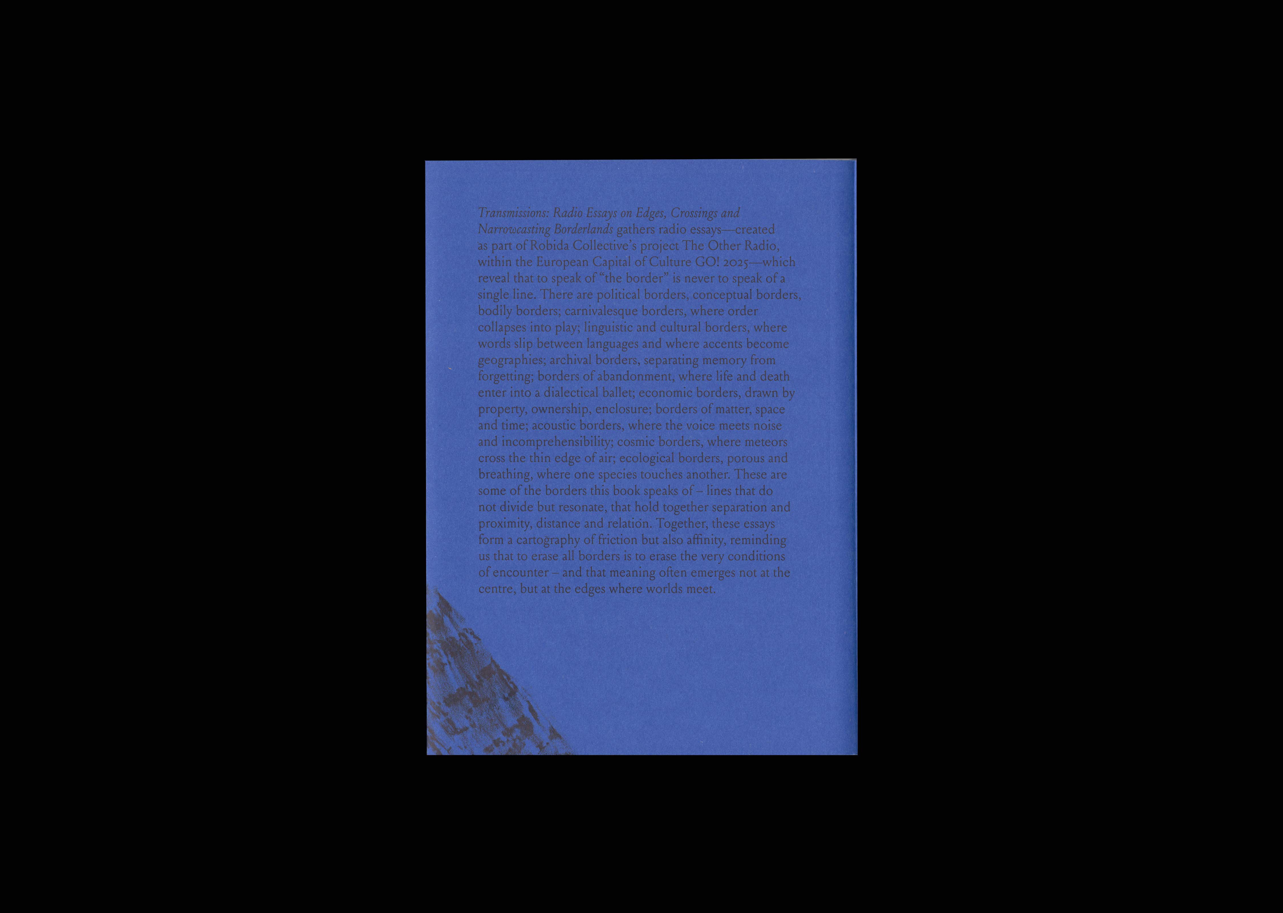 Transmissions: Radio Essays on Edges, Crossings and Narrowcasting Borderlands gathers radio essays—created as part of Robida Collective’s project Radio drugega/The Other Radio—which reveal that to speak of “the border” is never to speak of a single line. There are political borders, conceptual borders, bodily borders; carnivalesque borders, where order collapses into play; linguistic and cultural borders, where words slip between languages and where accents become geographies; archival borders, separating memory from forgetting; borders of abandonment, where life and death enter into a dialectical ballet; economic borders, drawn by property, ownership, enclosure; borders of matter, space and time; acoustic borders, where the voice meets noise and incomprehensibility; cosmic borders, where meteors cross the thin edge of air; ecological borders, porous and breathing, where one species touches another. These are some of the borders this book speaks of – lines that do not divide but resonate, that hold together separation and proximity, distance and relation. Together, these essays form a cartography of friction but also affinity, reminding us that to erase all borders is to erase the very conditions of encounter – and that meaning often emerges not at the centre, but at the edges where worlds meet.