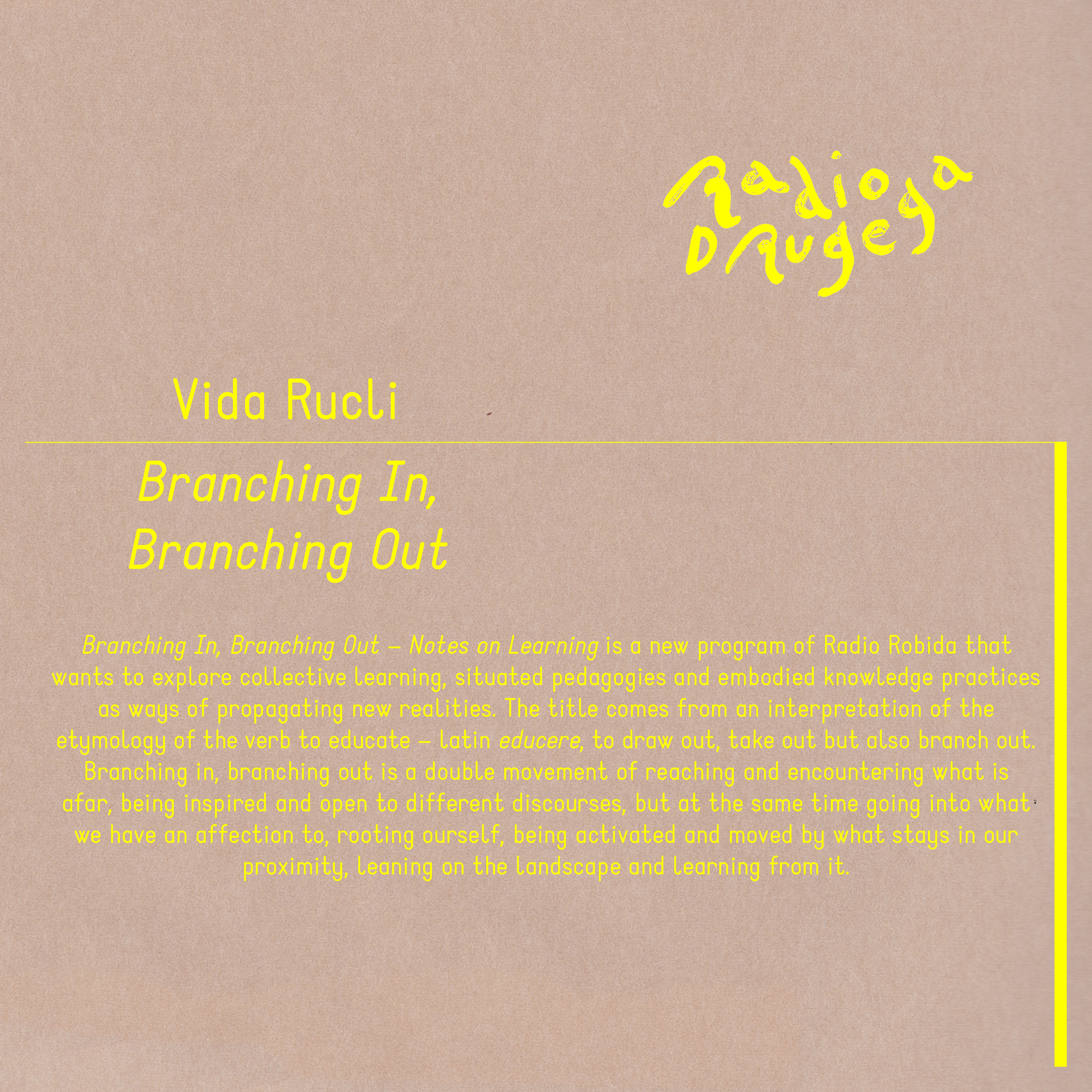Razvejanja/Branching in, Branching out je nov program Radia Drugega, ki želi raziskati kolektivno učenje, situirane pedagogike in prakse utelešenega znanja kot načine propagiranja novih realnosti. Naslov oddaje izhaja iz razlage etimologije glagola izobraževati – latinsko educere, izvleči, a tudi razvejati.