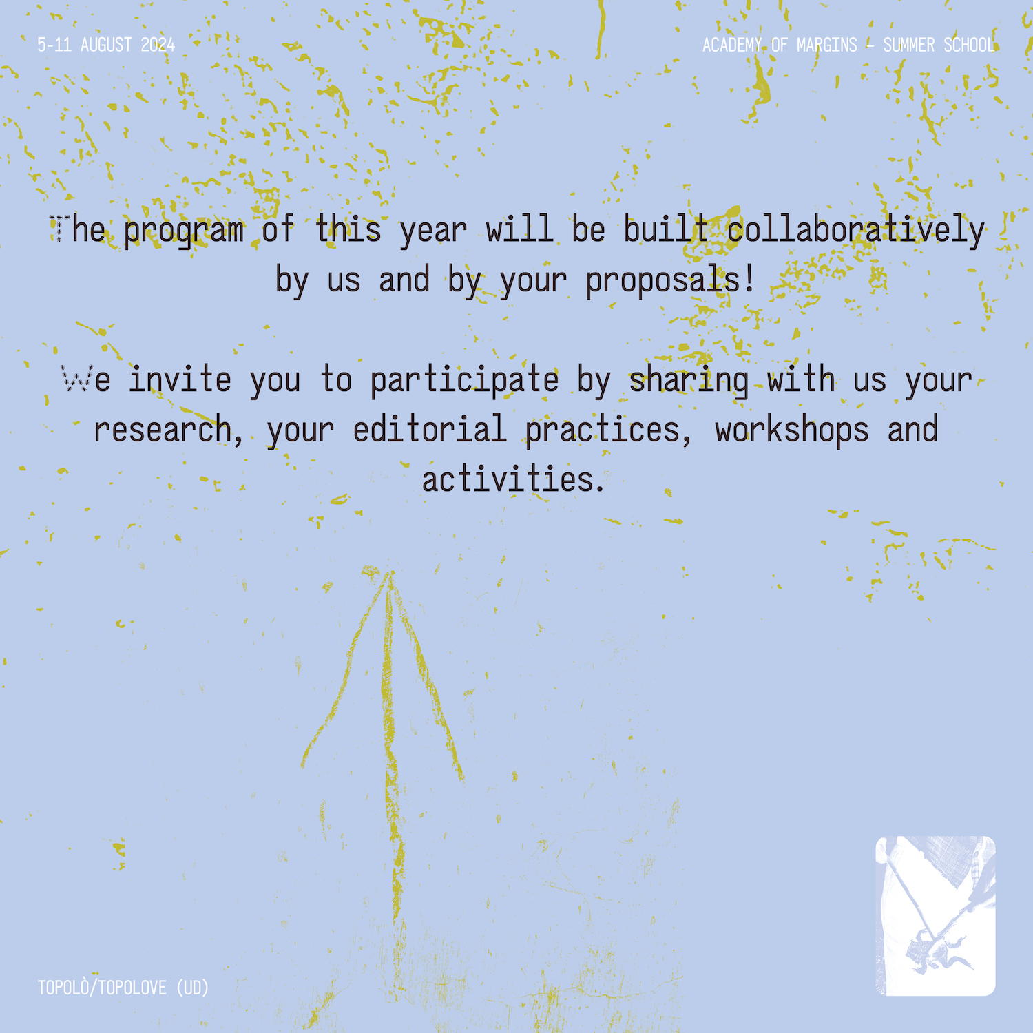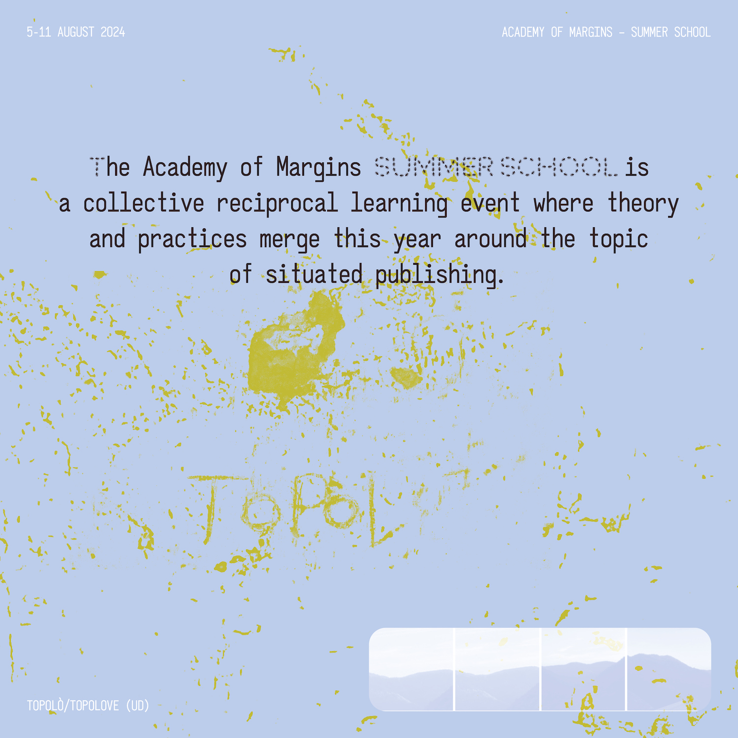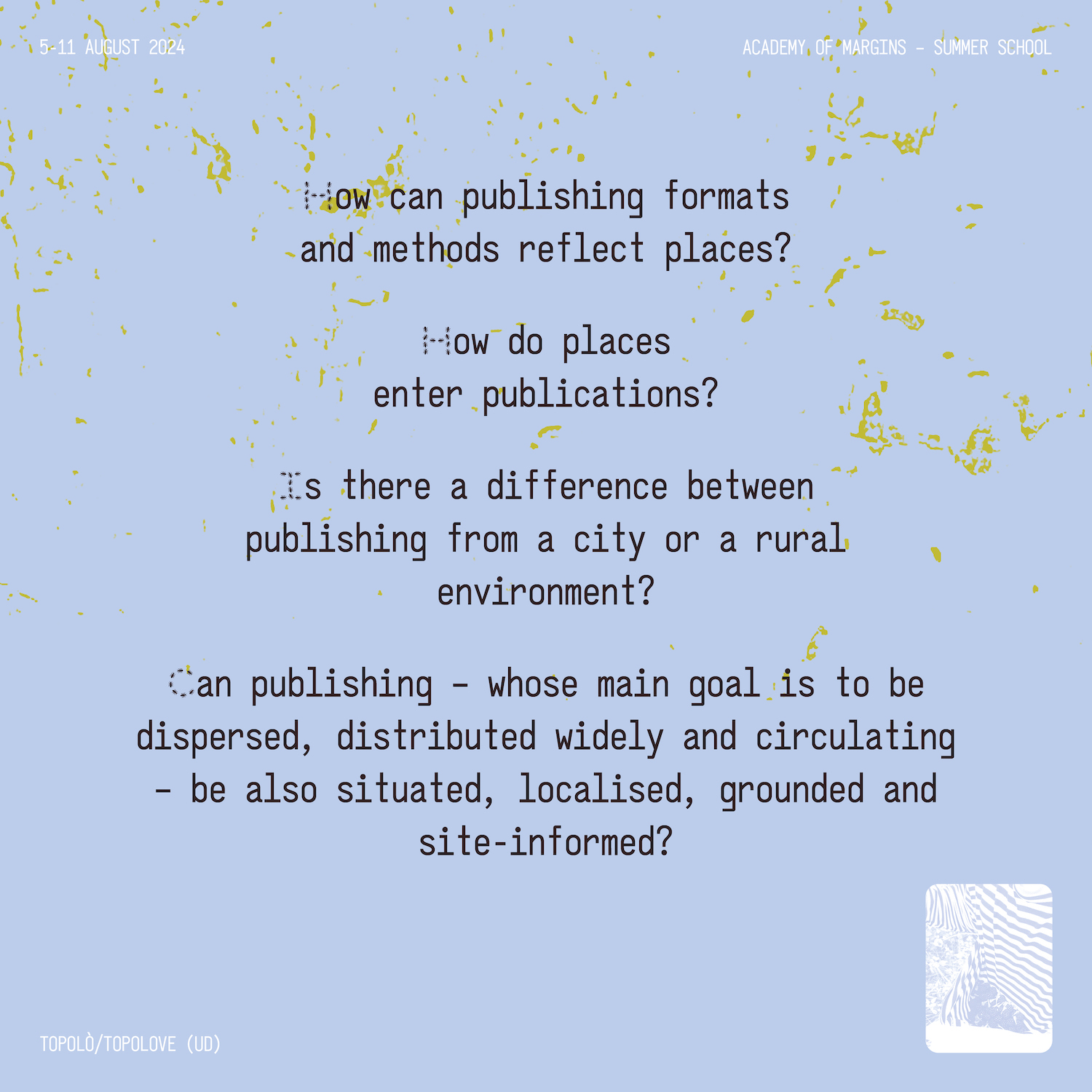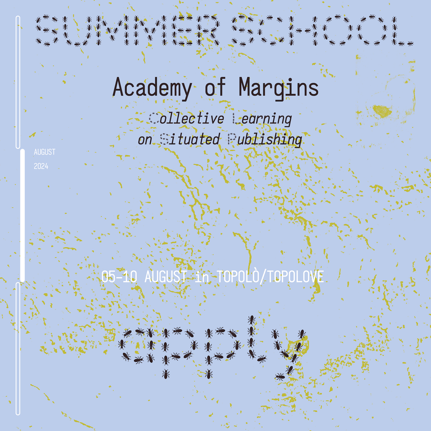 The Academy of Margins Summer School will explore what we tentatively call situated publishing, meaning publishing practices that hold, host, are informed by and reflect places. The week of collective learning will be guided by the following questions: how can publishing formats and methods reflect places? Is there a difference between publishing from a city or a rural environment? How do places enter publications – beyond the usual formality of being mentioned in colophons? Can publishing—whose main goal is to be dispersed, distributed widely and circulating—be also situated, localised, grounded and site-informed?