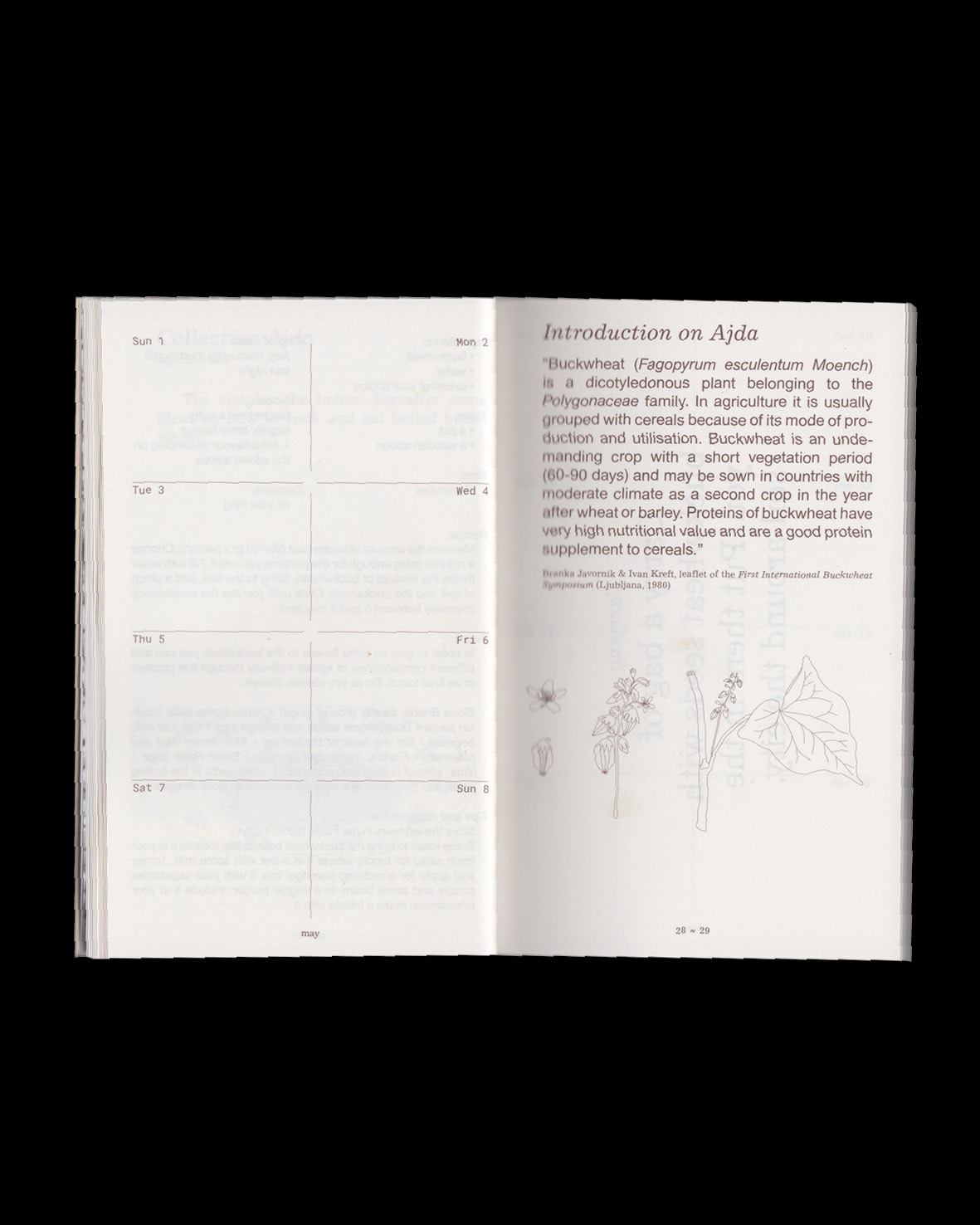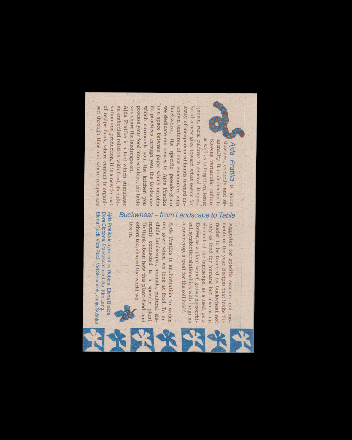 Ajda means buckwheat, the plant-food we dedicated our attention and research to. Ajda is a plant and food which characterises the vernacular (food)culture of Slovenia since it thrived on its landscapes from the 15th century onwards and was slowly abandoned during the 20th century. Through this publication, we invite you to take a new perspective toward this plant-food and to discover why buckwheat is beneficial for our bodies and for the environment.