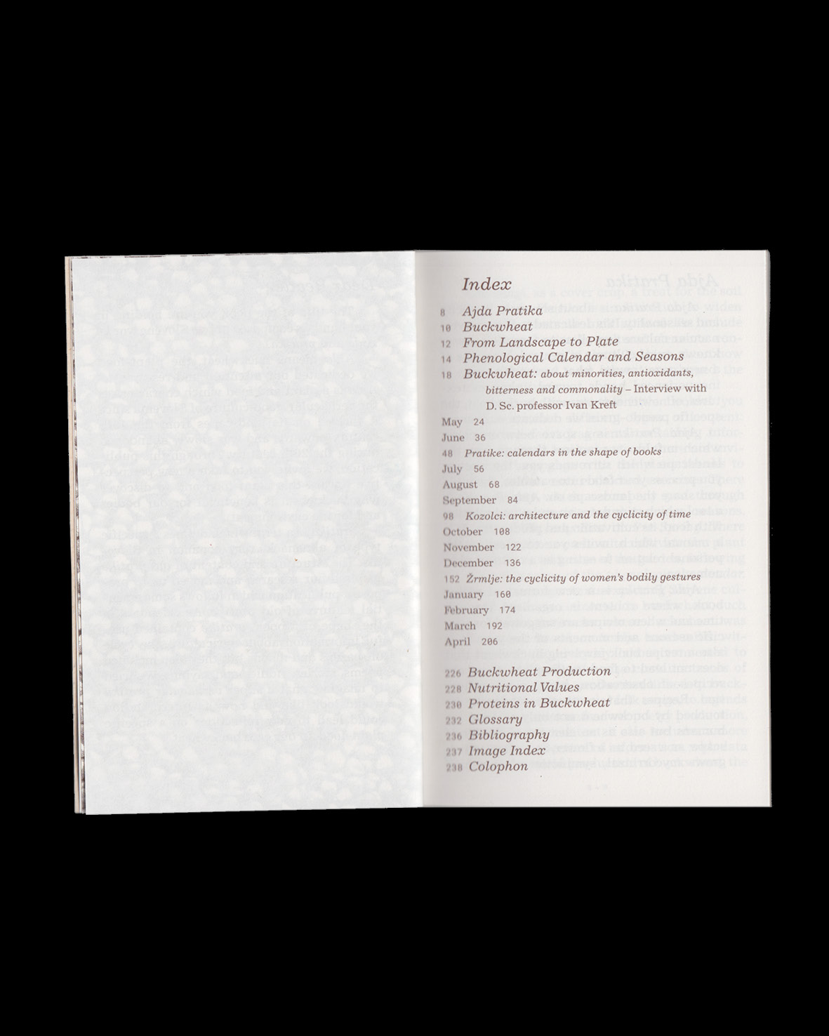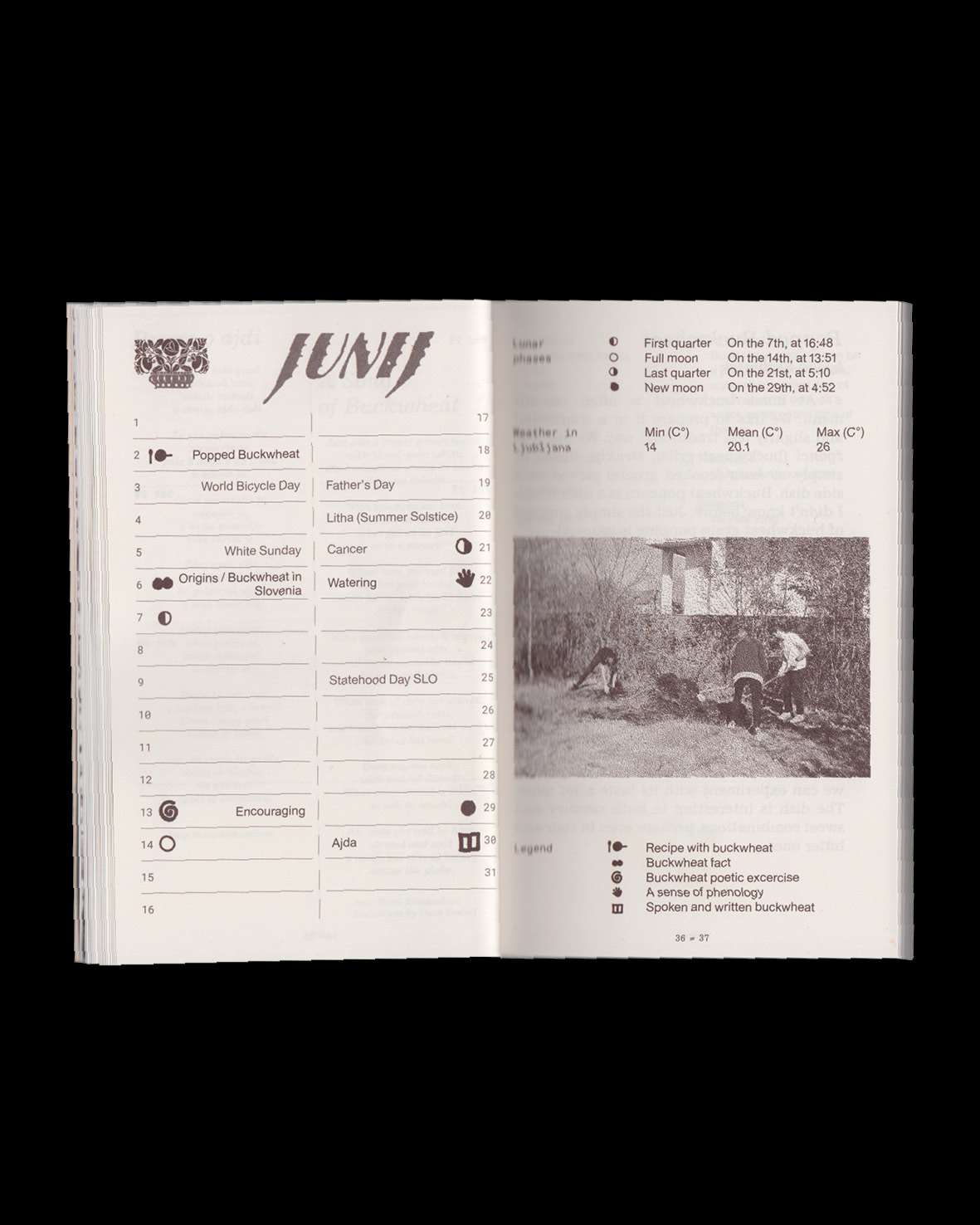 Pratika is a term which defines a specific type of almanack, very common in Slovenia. The structure and content of old pratike inspired our research and moved us to pro- pose a publication which follows some essential features of old pratike. As calendars in the shape of a book, pratike contained useful information about agriculture, the cycle of seasons and moons but they also included poems, stories, riddles and sayings. We tried to imagine what a super vernacular pratika would look like and how its interpretation could lead to new reflections on a specific plant-food, in our case buckwheat.