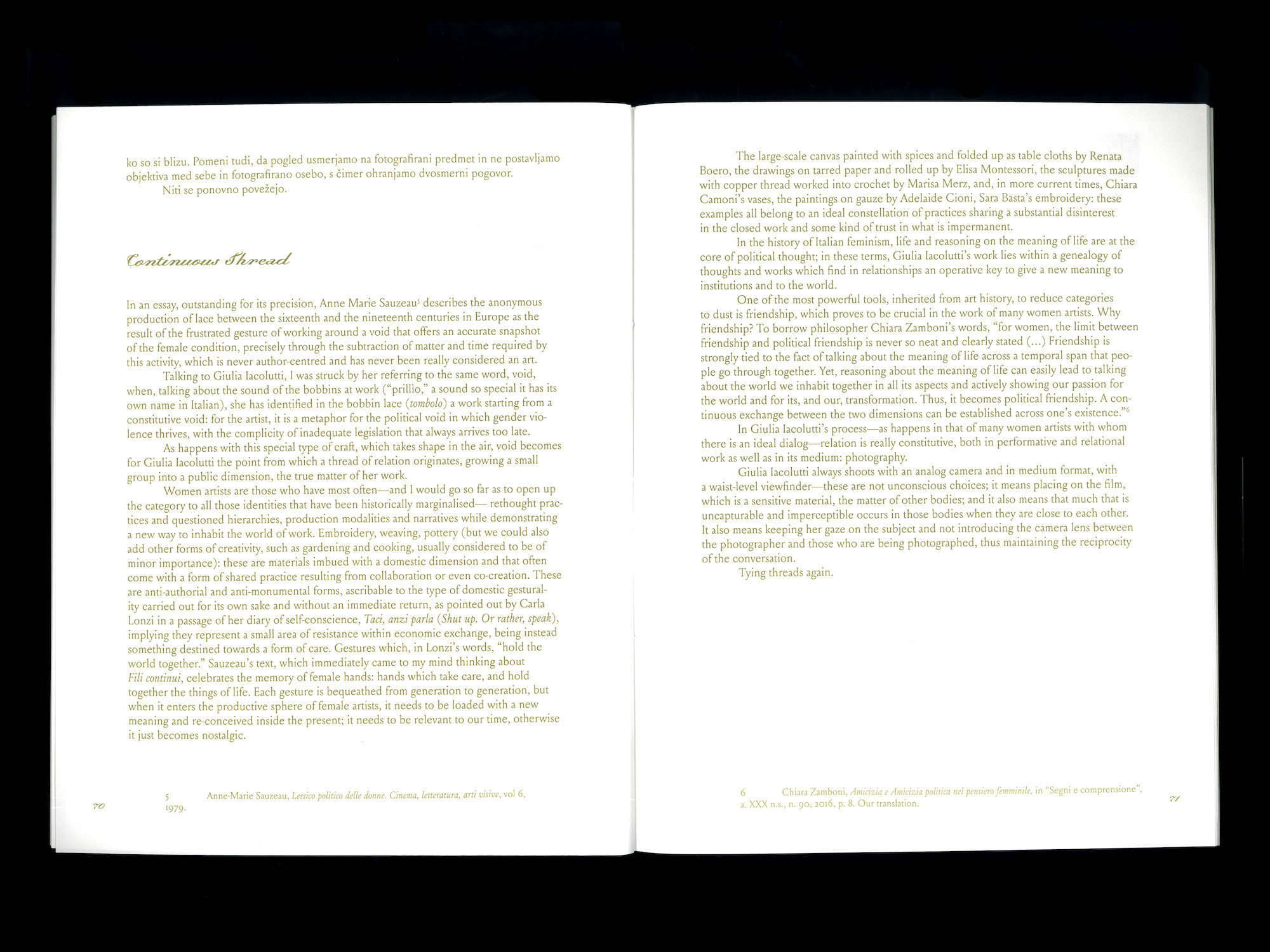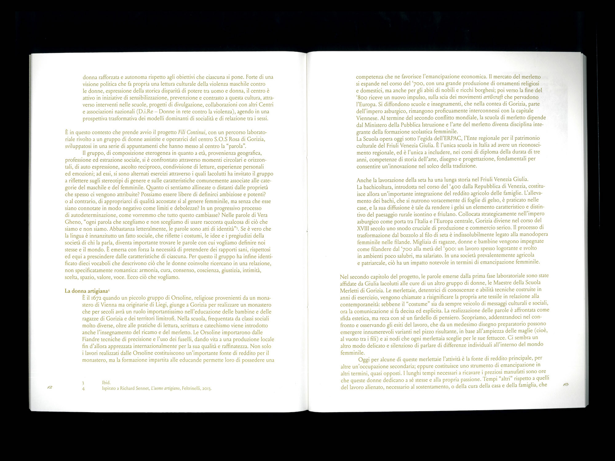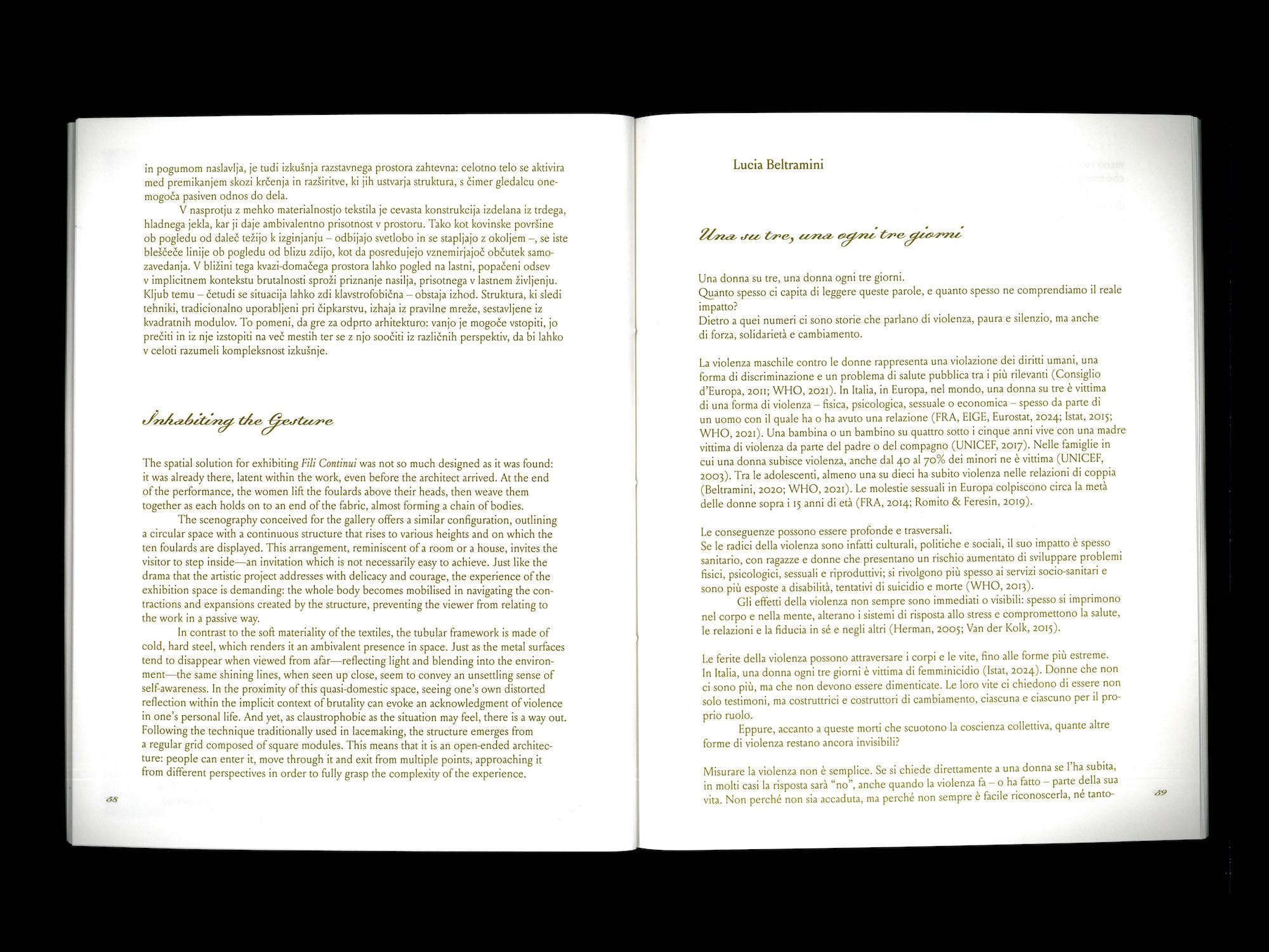 Il libro Fili Continui racconta l’omonimo progetto ideato dall’artista Giulia Iacolutti e prodotto dall’Associazione culturale ETRARTE, in cui danza, seta e merletto si intrecciano in un lavoro che rilegge la tradizione come pratica collettiva in contrasto alla violenza di genere.