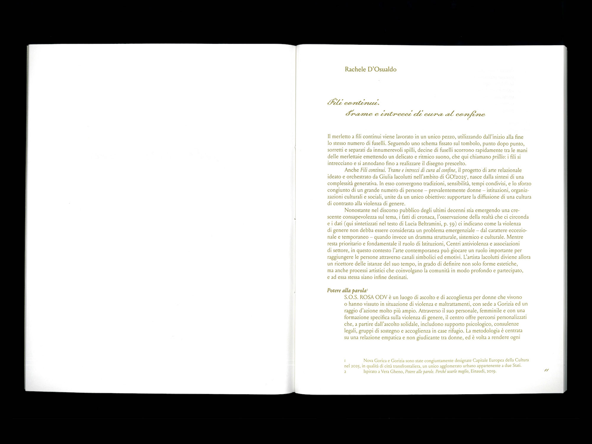 Fili continui è parte delle iniziative finanziate dalla Regione Friuli Venezia Giulia nell’ambito di GO!2025 Nova Gorica – Gorizia Capitale Europea della Cultura, con il supporto della Commissione Pari Opportunità del Comune di Udine e la collaborazione di S.O.S. Rosa ODV, ERPAC / Scuola Merletti di Gorizia, Galerija GONG, Robida, Gruppo Folcloristico Santa Gorizia, Arearea, IOTUNOIVOI Donneinsieme.