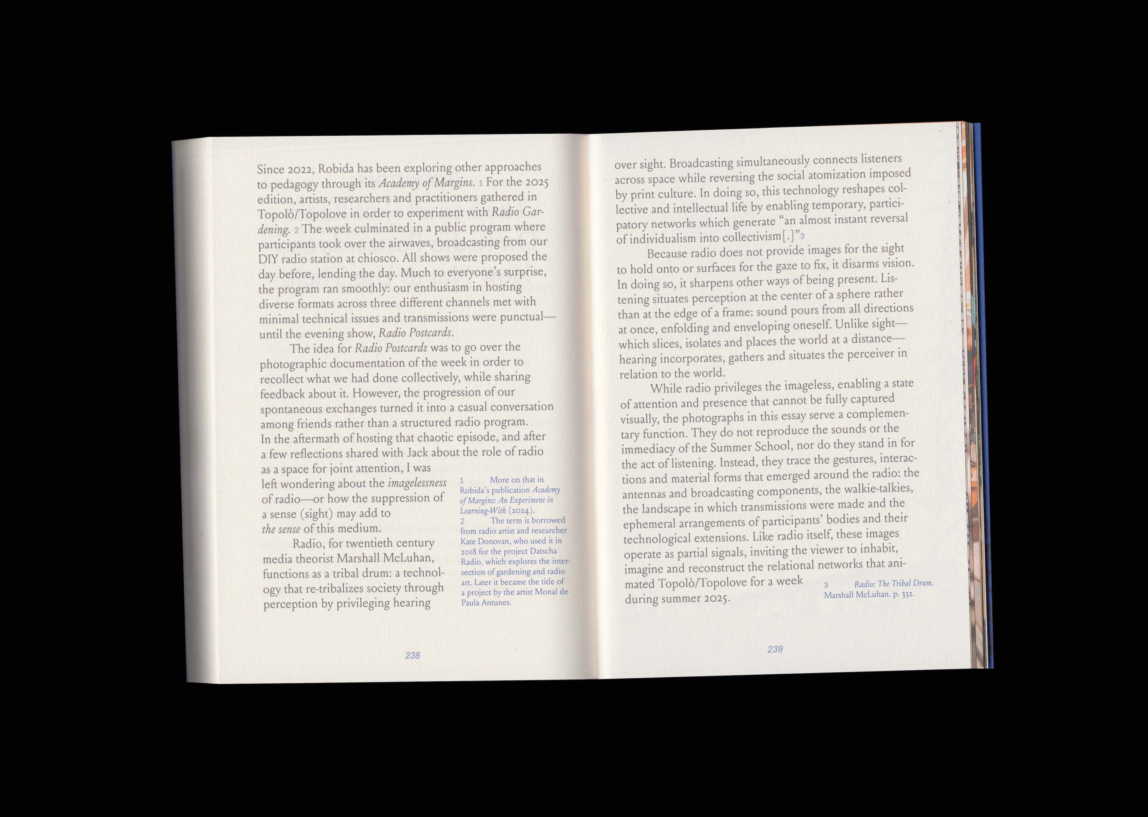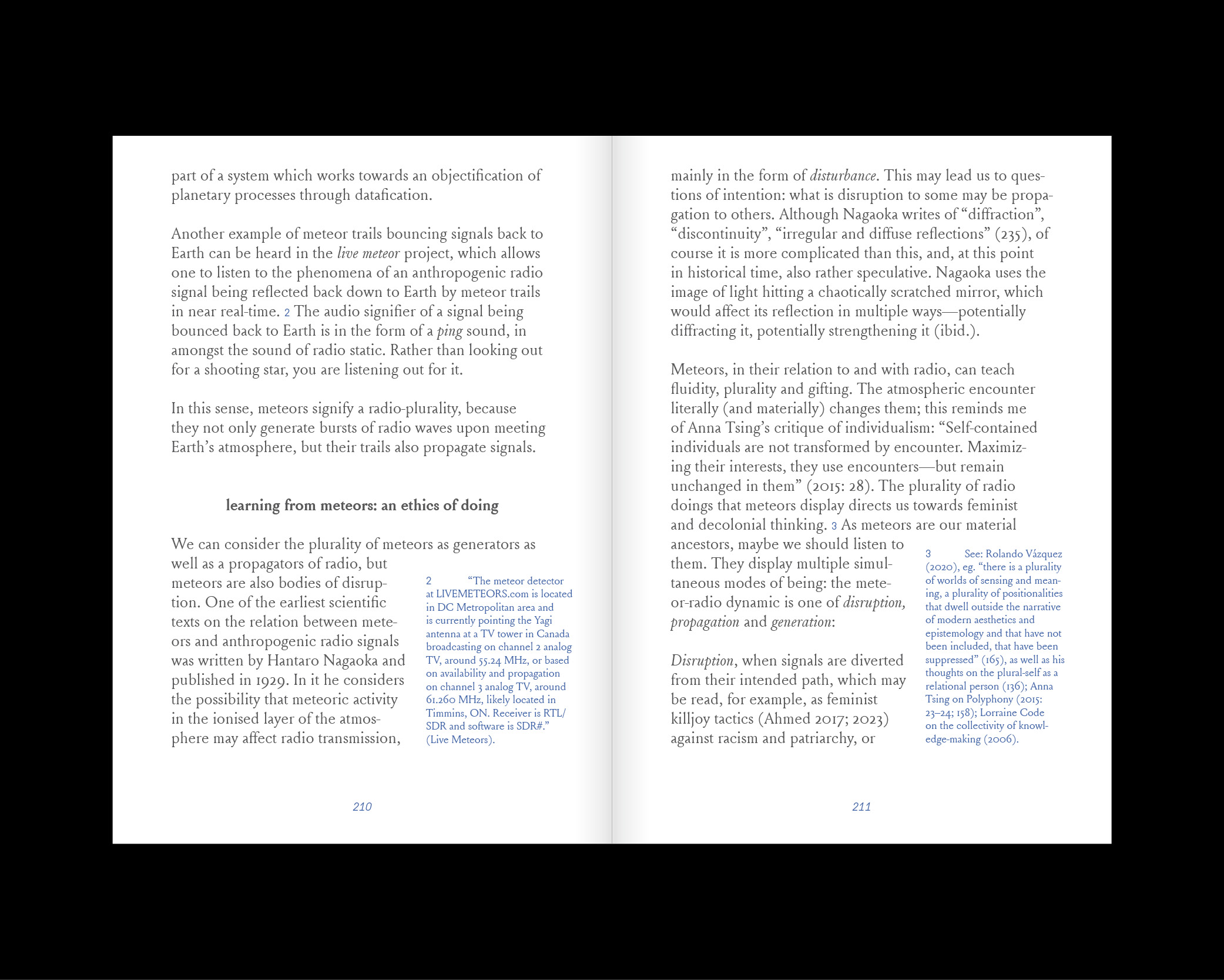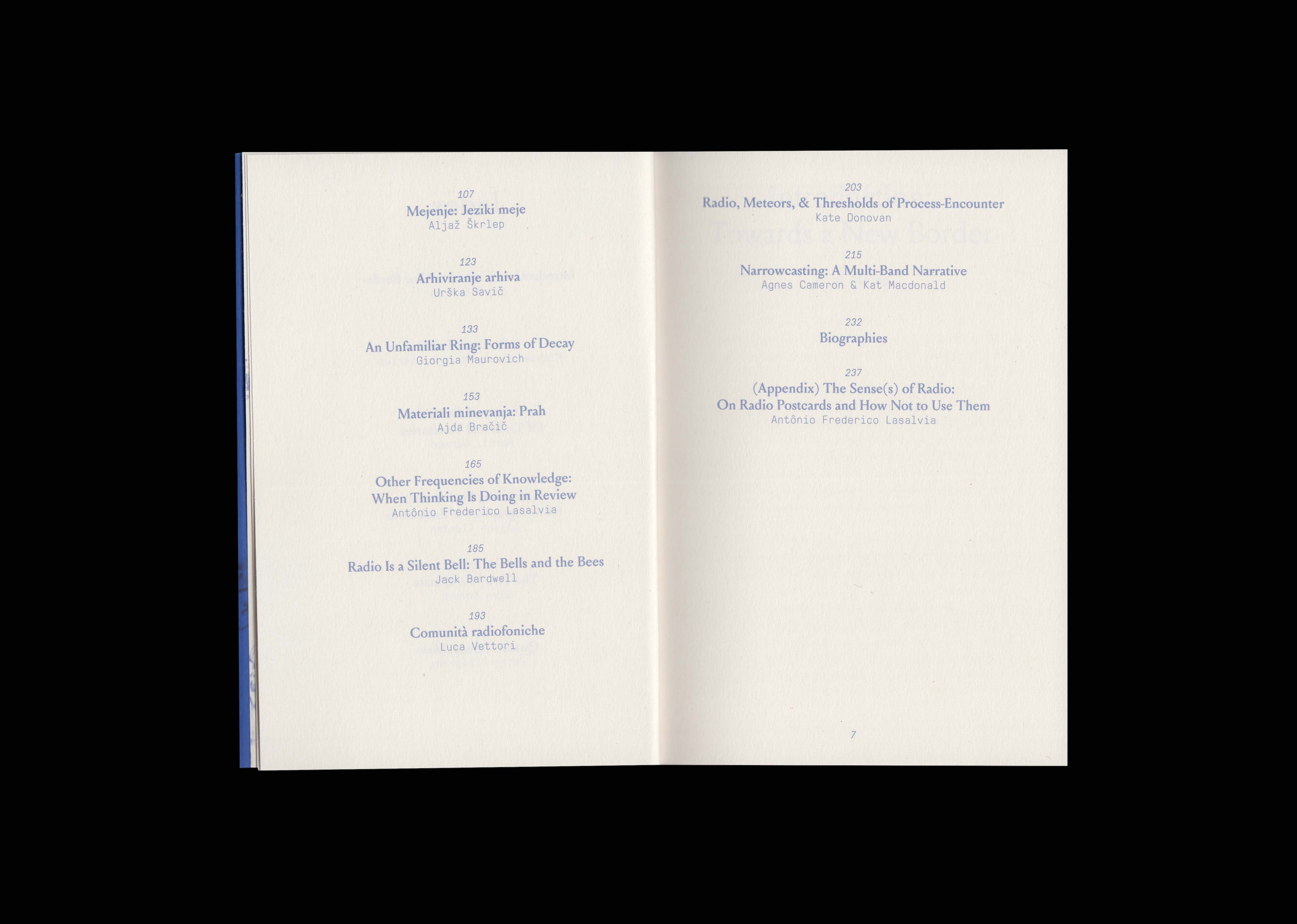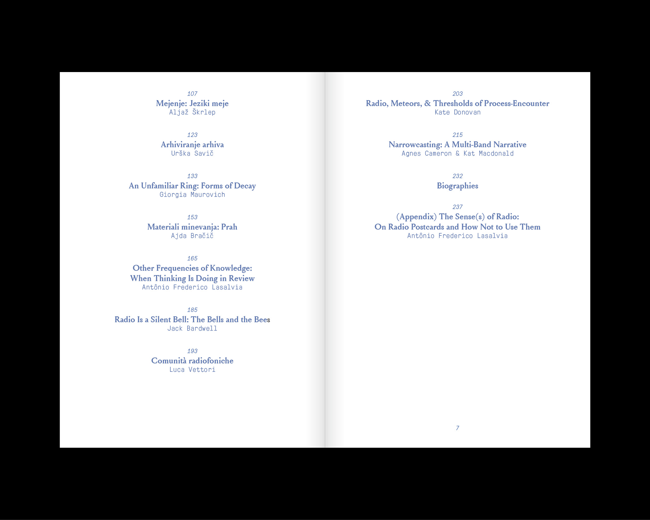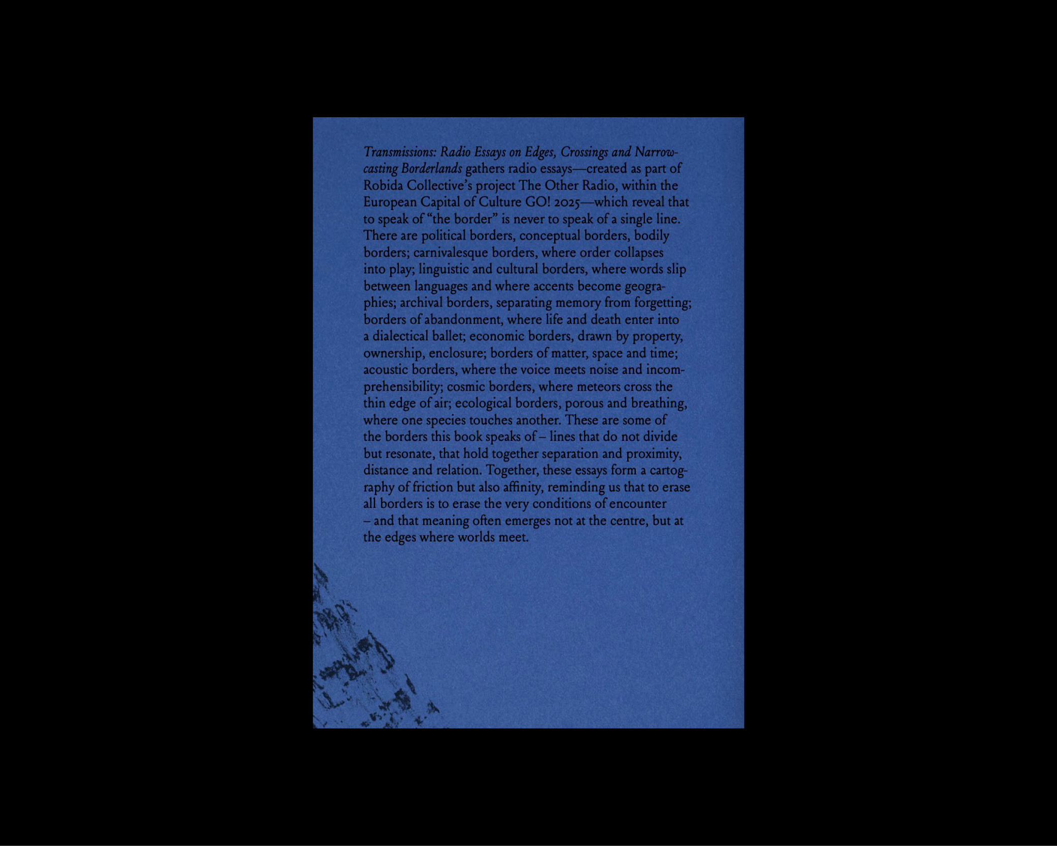 Transmissions: Radio Essays on Edges, Crossings and Narrowcasting Borderlands gathers radio essays—created as part of Robida Collective’s project Radio drugega/The Other Radio—which reveal that to speak of “the border” is never to speak of a single line. There are political borders, conceptual borders, bodily borders; carnivalesque borders, where order collapses into play; linguistic and cultural borders, where words slip between languages and where accents become geographies; archival borders, separating memory from forgetting; borders of abandonment, where life and death enter into a dialectical ballet; economic borders, drawn by property, ownership, enclosure; borders of matter, space and time; acoustic borders, where the voice meets noise and incomprehensibility; cosmic borders, where meteors cross the thin edge of air; ecological borders, porous and breathing, where one species touches another. These are some of the borders this book speaks of – lines that do not divide but resonate, that hold together separation and proximity, distance and relation. Together, these essays form a cartography of friction but also affinity, reminding us that to erase all borders is to erase the very conditions of encounter – and that meaning often emerges not at the centre, but at the edges where worlds meet.