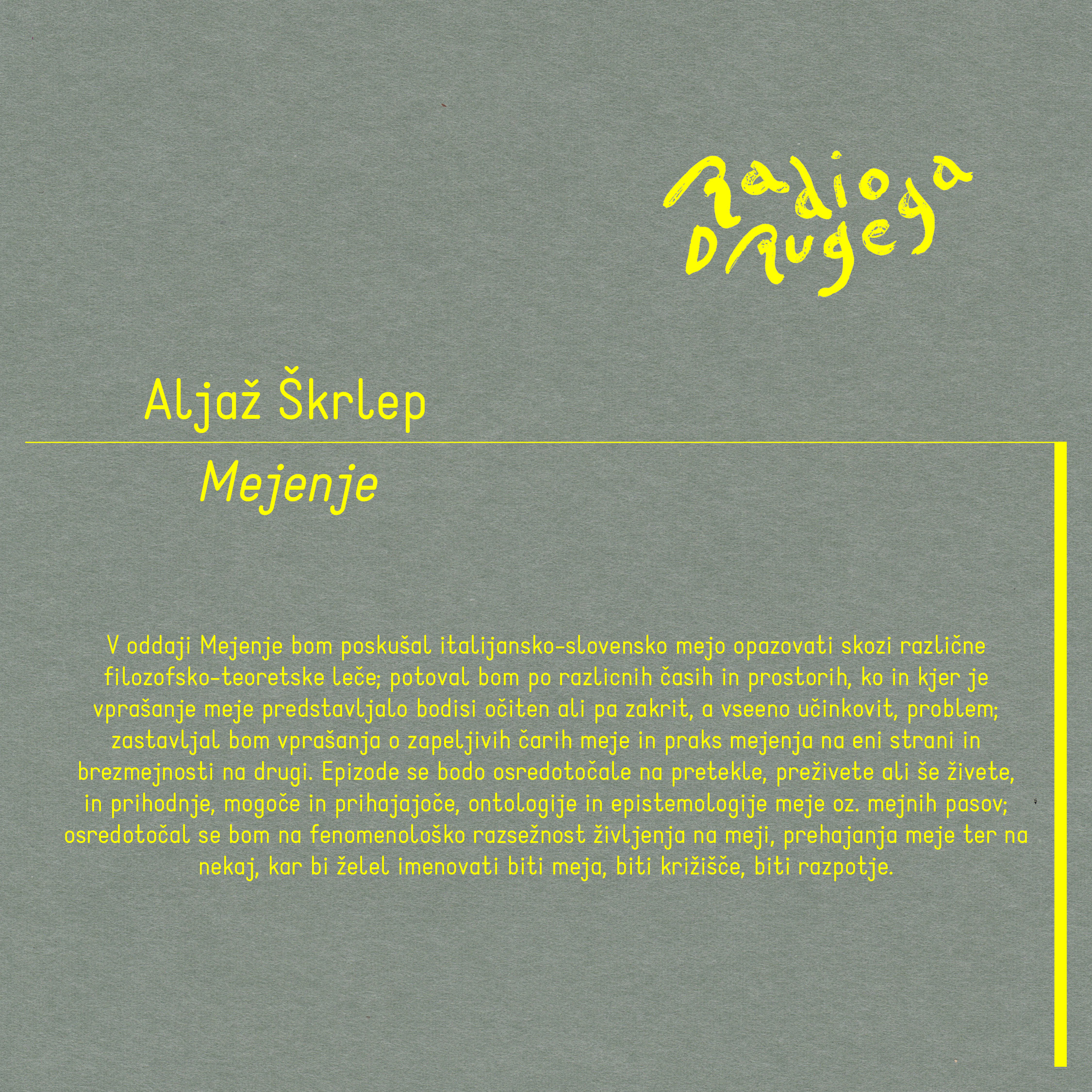 In the show Bordering/Mejenje, I will try to observe the Italian-Slovenian border through various philosophical and theoretical lenses; I will travel through different times and places when and where the question of the border was either an obvious or a hidden but still effective problem; I will ask questions about the seductive charms of the border and the practices of bordering, on the one hand, and borderlessness, on the other. The episodes will focus on past, outlived or still lived, and future, possible and upcoming, ontologies and epistemologies of the border or borderlands, border zones; I will focus on the phenomenological dimension of living on the border, crossing the border, and on something I would like to call being a border, being a crossroads, being a crossroads.