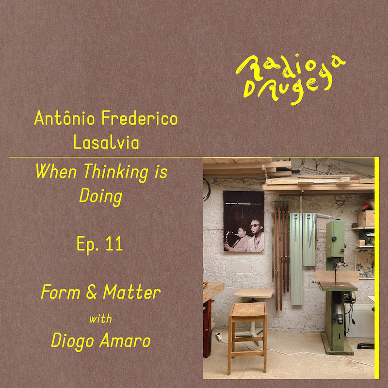 In the eleventh episode of When Thinking is Doing, Antônio Frederico Lasalvia is joined by the architect and cabinetmaker Diogo Amaro in order to think about the border between form and matter. The conversation touches on themes like anticipation and spontaneity in work, the role of prototyping, the contrast between serial and singular production and the consequences of an empirical approach to design.