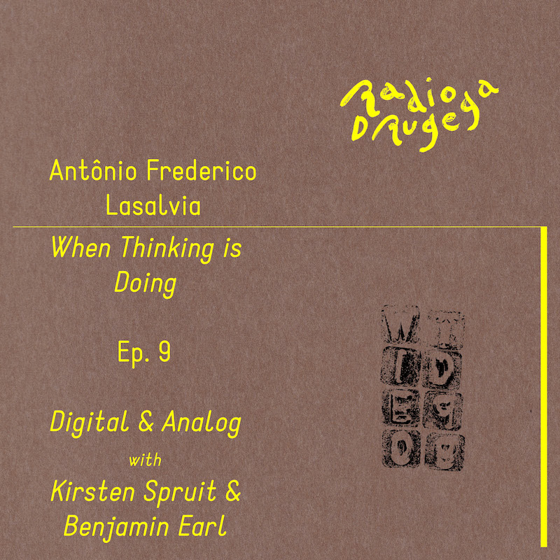 In the ninth episode of When Thinking is Doing, Antônio Frederico Lasalvia is joined by Kirsten Spruit and Benjamin Earl in order to think through the border between the digital and the analog. As we look for procedures analogous to craft within the virtual sphere, we consider themes like the poetic web, handmade websites, Ben and Kirsten’s “code of conduct of code”, as well as their growing interest in rituals of maintenance.