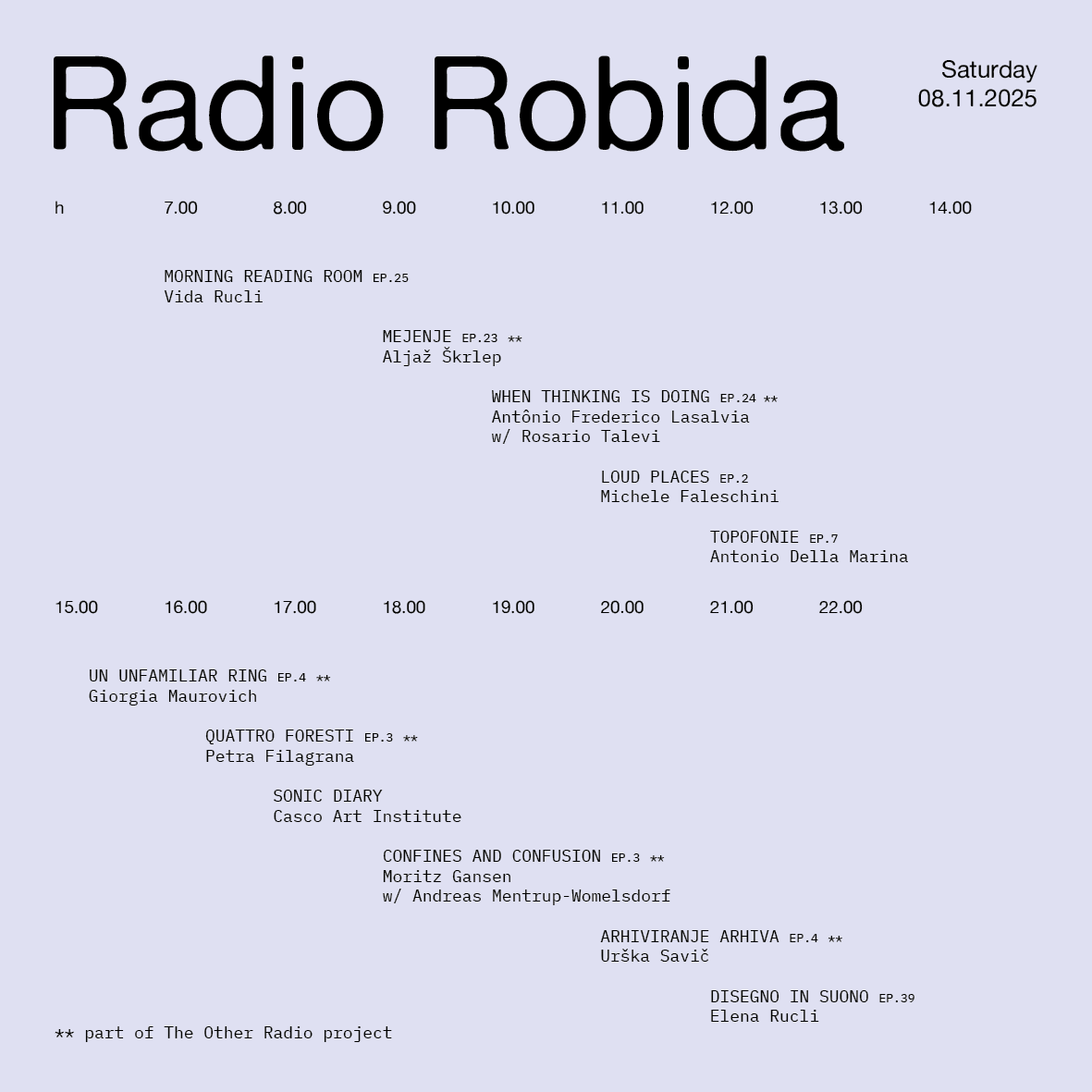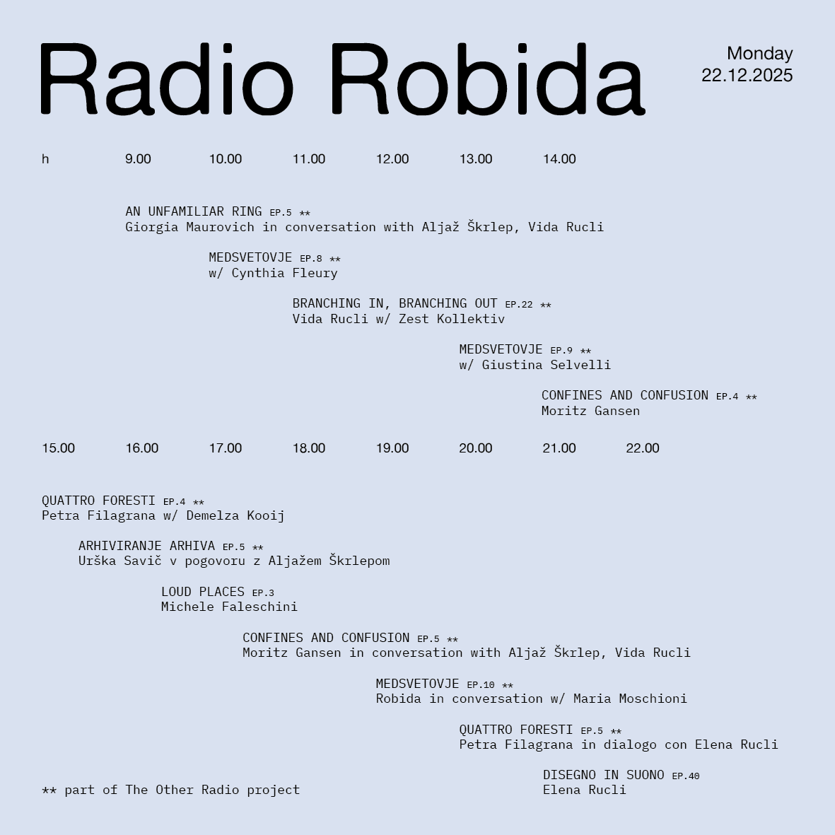 Quickly after the workshop Hearing the Margins, which was held in Topolò in mid-September 2021, led by our now-good-friend Jack Bardwell, we started narrowcasting every second Saturday. The umbrella topic of our shows is a topic that keeps coming back in our everyday thinkings and lives: the margin. Whether it be through media, literary, landscape studies, sound-drawing, music, friendly talks or casual morning readings of theoretical texts, the topic of the margin is in a way always present in our program and is certainly a leitmotif of Robida in general.