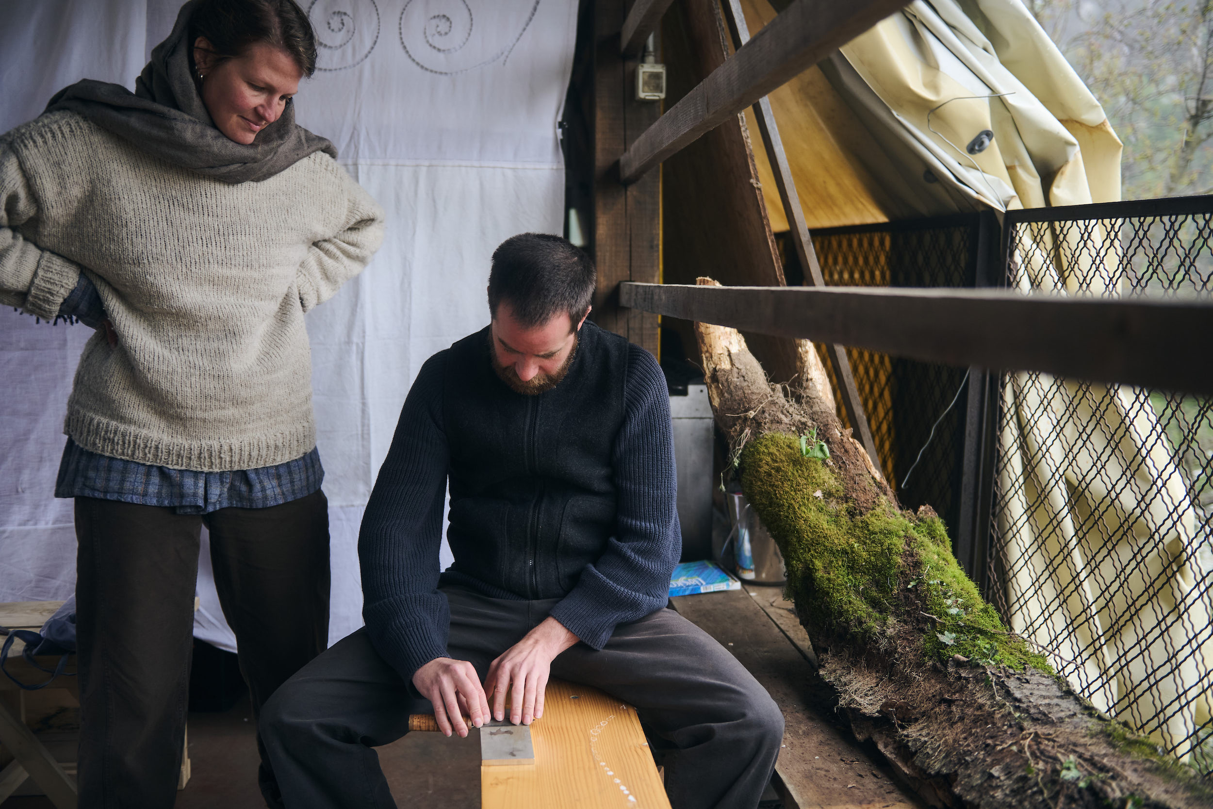Diogo and Madalena guided us through their craft. For three days, hatchets bit into bark, hammers stroke gauges and knives sliced off small chips of wood. Although our hands were constantly touching things, my memory of this time is tied to other two senses: smell and hearing. The atmosphere of us working together was filled with the fragrant scent of green cherrywood, which reverberated with the continual percussion of tools at work.